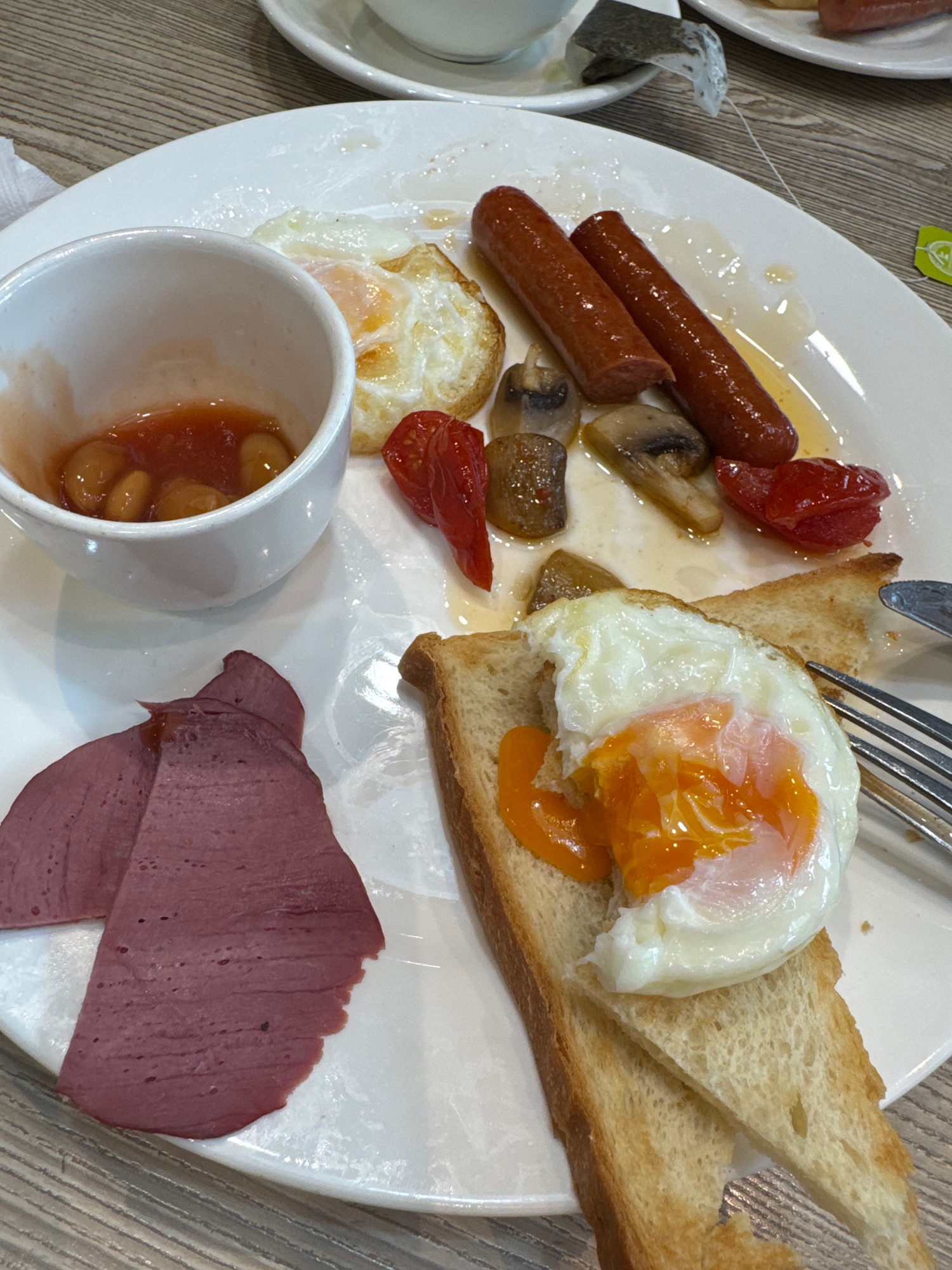 This image displays a hearty breakfast meal presented on a white ceramic plate, resting on a light-colored wooden table. The scene suggests an indoor dining environment, likely in the morning, possibl…read more