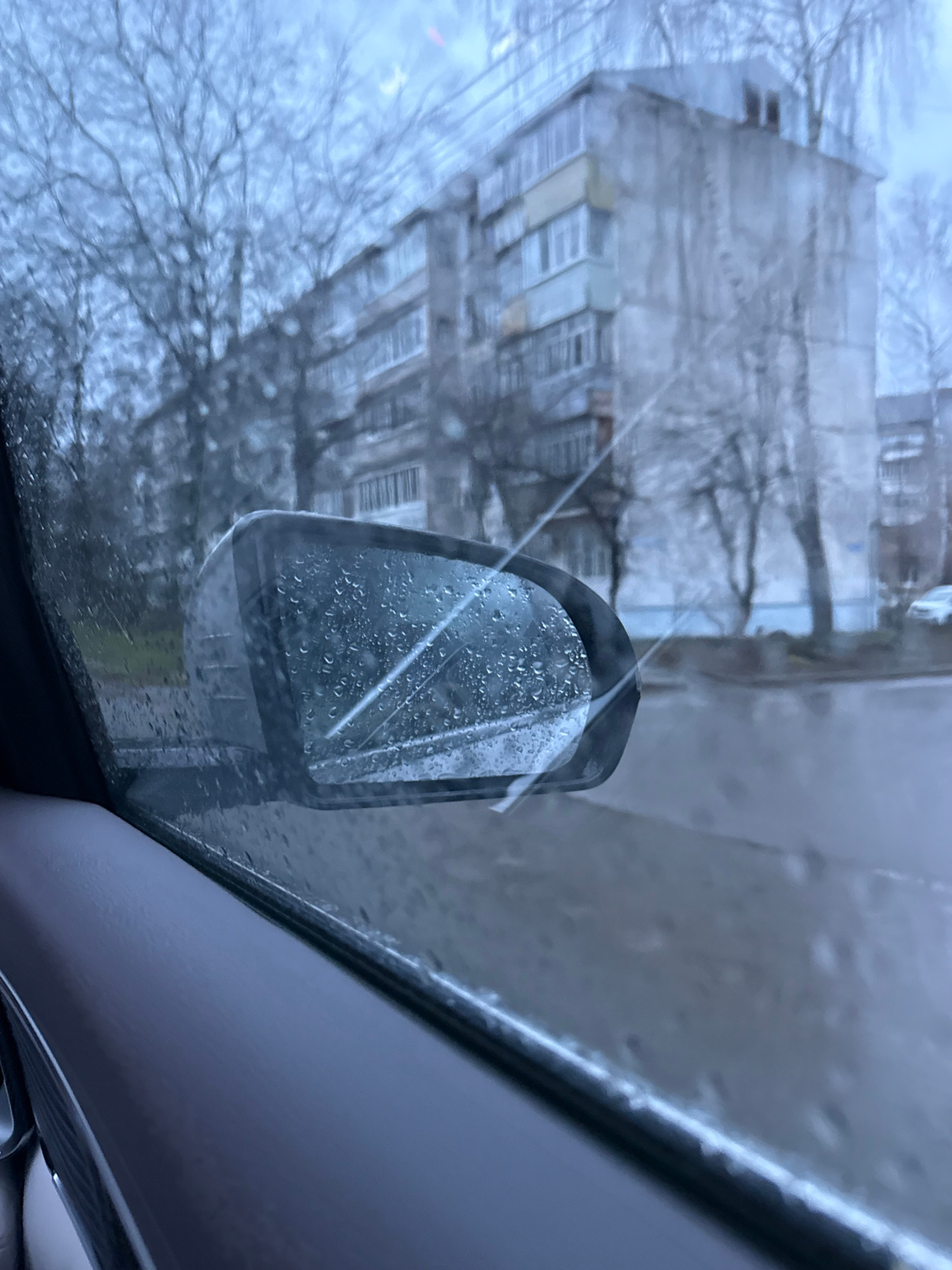 The image shows a rainy day view from inside a car, looking out through the windshield. The car's side mirror is visible on the left. Through the rain-streaked glass, a building is visible, along with…read more