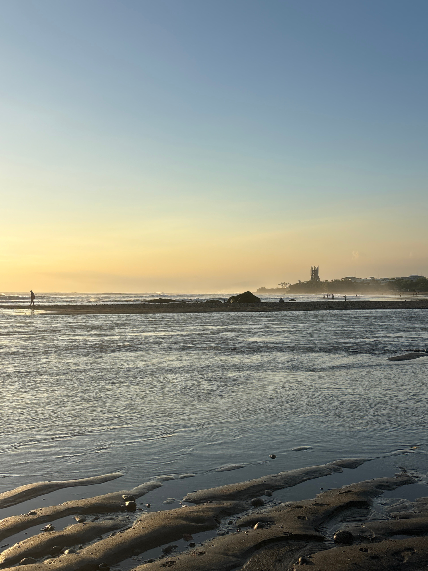 The image captures a serene coastal landscape during golden hour, likely sunset or sunrise, with a wide horizon separating the sky from the ocean and beach. The sky occupies the upper portion, display…read more