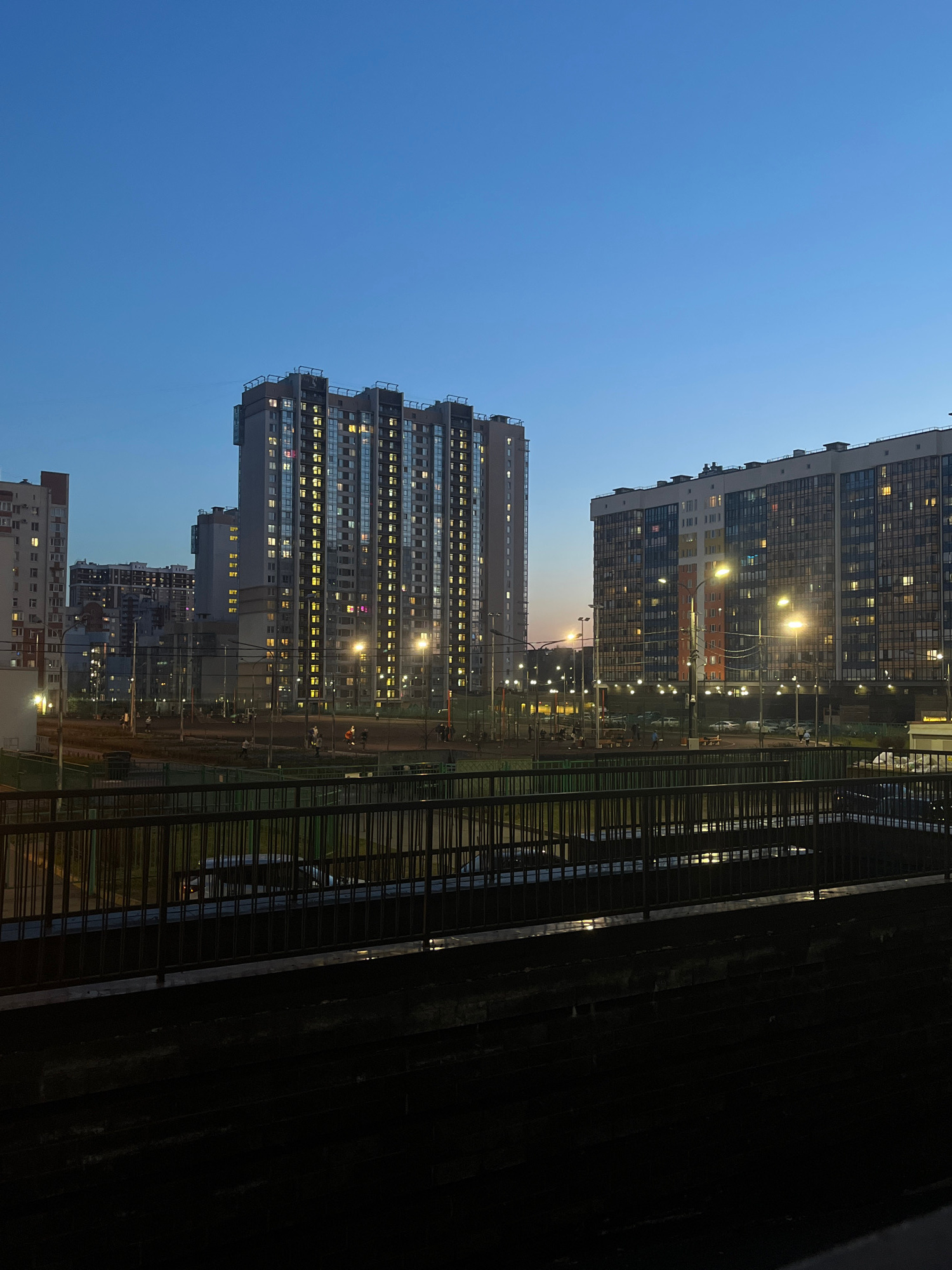 The image shows a view of apartment buildings in the city of Vsevolozhsk, Russia at dusk. The sky is a gradient of blue. The buildings are modern, high-rise apartment blocks with many lit windows. A m…read more
