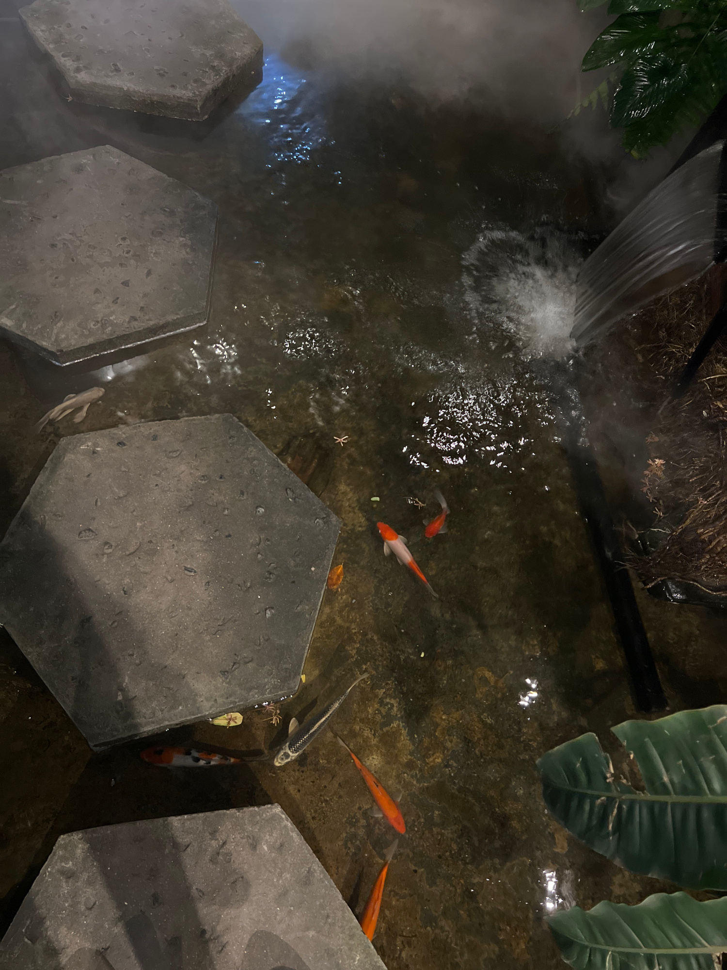 The image presents an overhead view of a serene water feature, likely a koi pond, set in a dimly lit environment. The scene is characterized by the interaction of water, fish, natural elements, and ar…read more
