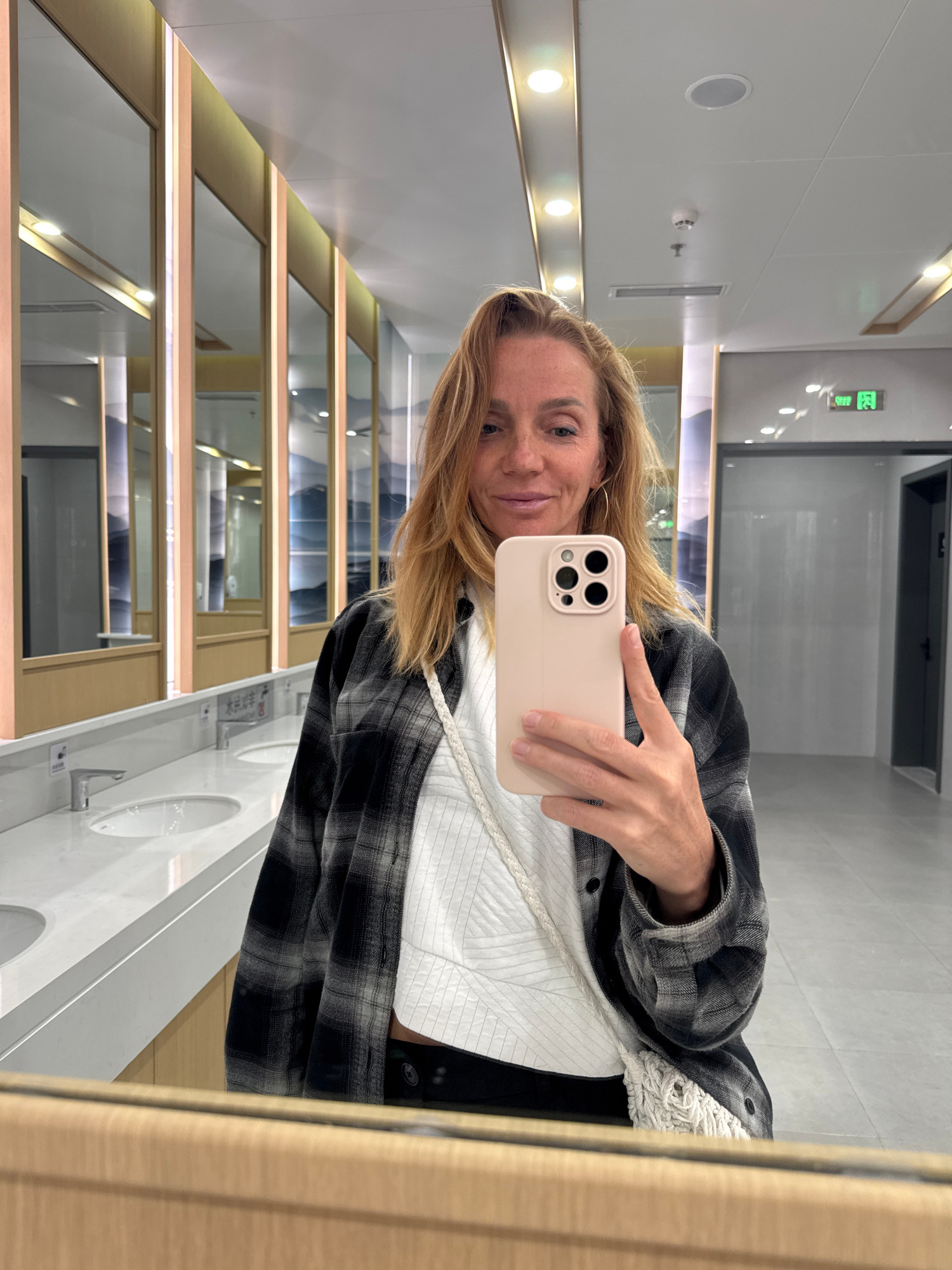 The photograph appears to be a self-portrait taken in a bathroom, likely in a commercial or public space. The subject is a fair-skinned individual with blonde hair, facing the camera and holding a sma…read more