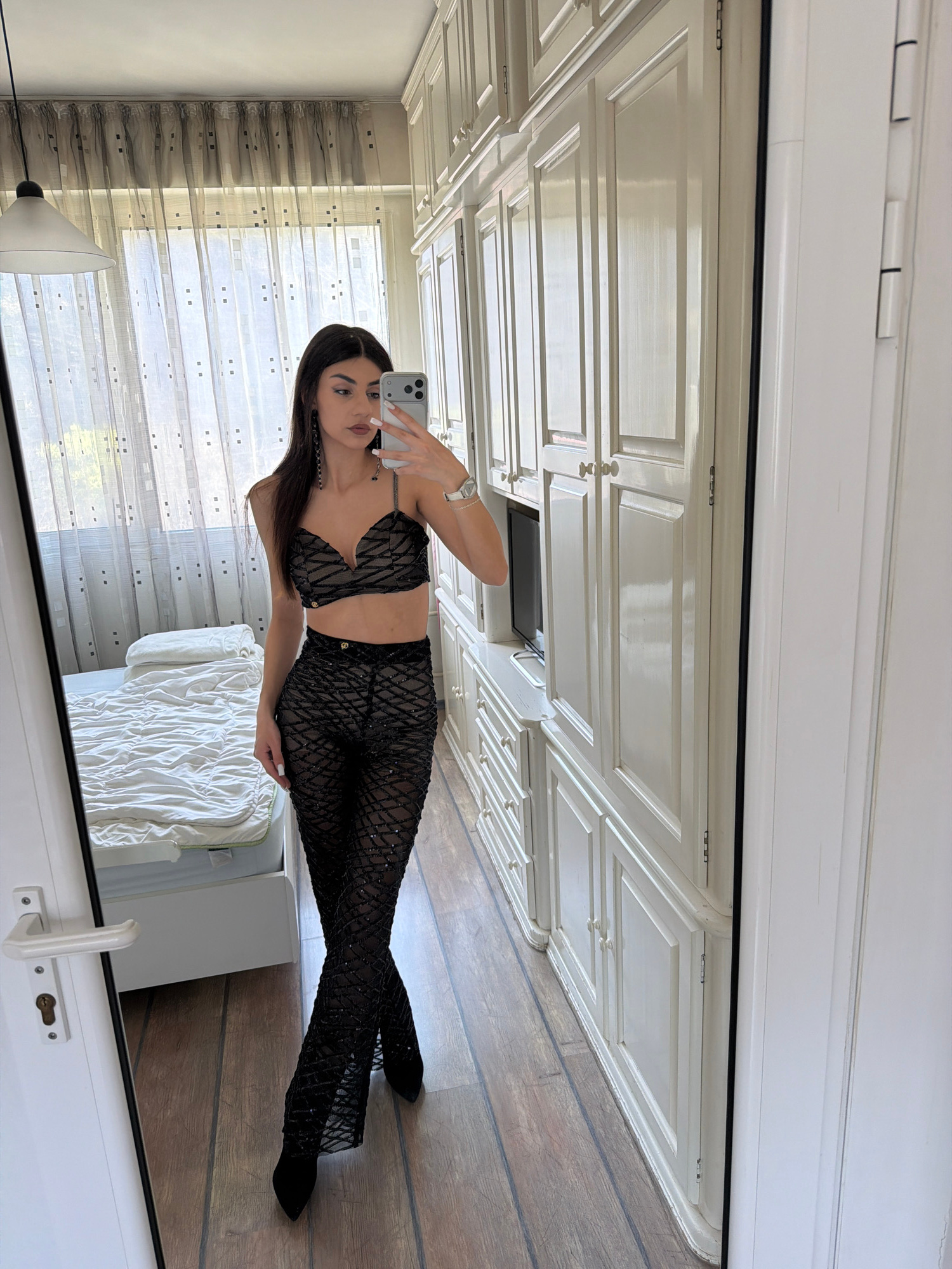A woman is posing for a photo in what appears to be a bedroom or walk-in closet. She is wearing a two-piece black outfit with a mesh pattern and black heels. She is holding a cell phone in her right h…read more