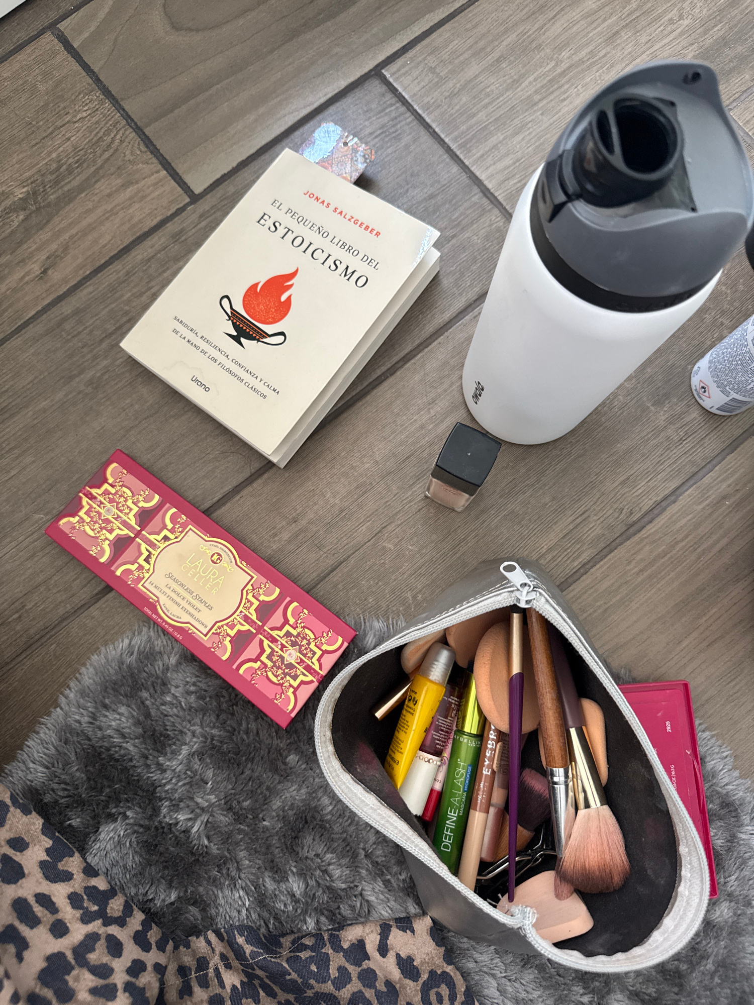 The scene presents a variety of personal items arranged on a wooden surface that resembles a plank floor. A white water bottle with a black lid sits prominently. Next to it, there is a book titled "El…read more