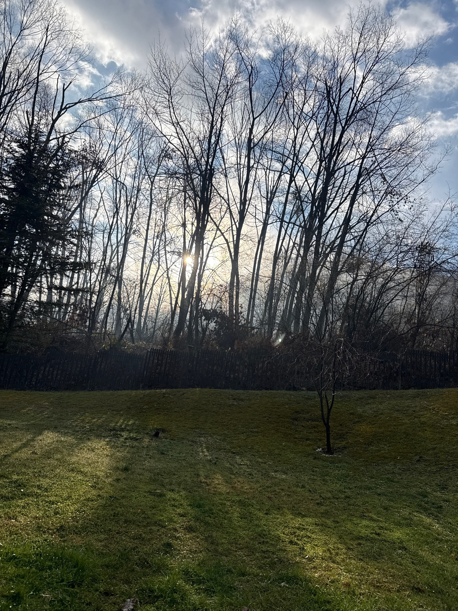 The image depicts a landscape scene, possibly taken in or near the city of Etropole, Bulgaria. Bare deciduous trees dominate the left portion of the frame, their branches silhouetted against a sky wit…read more