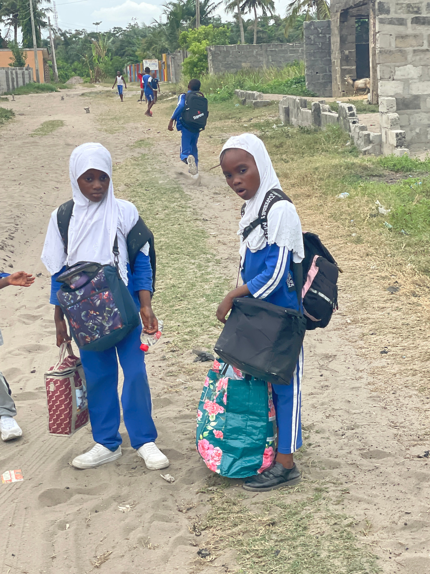 Two schoolgirls in blue and white uniforms, wearing white hijabs, stand on a sandy area in Badagry, Nigeria. One girl carries a black backpack and a floral bag, while the other has a patterned shoulde…read more