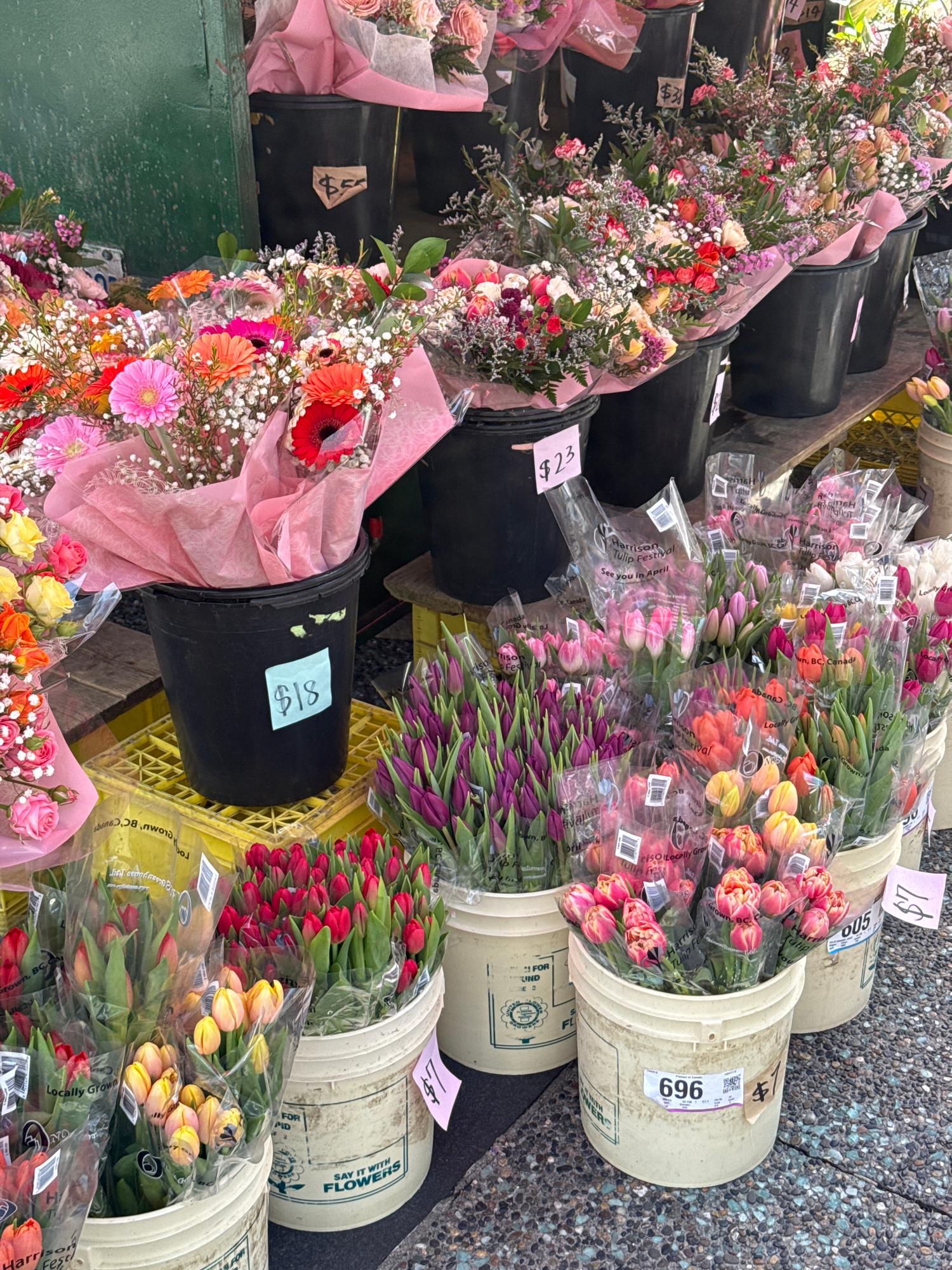 The image shows a street-side flower stand with a variety of floral arrangements and bundled tulips for sale. The arrangements, priced at $18 and $23, are displayed in black buckets and wrapped in pin…read more