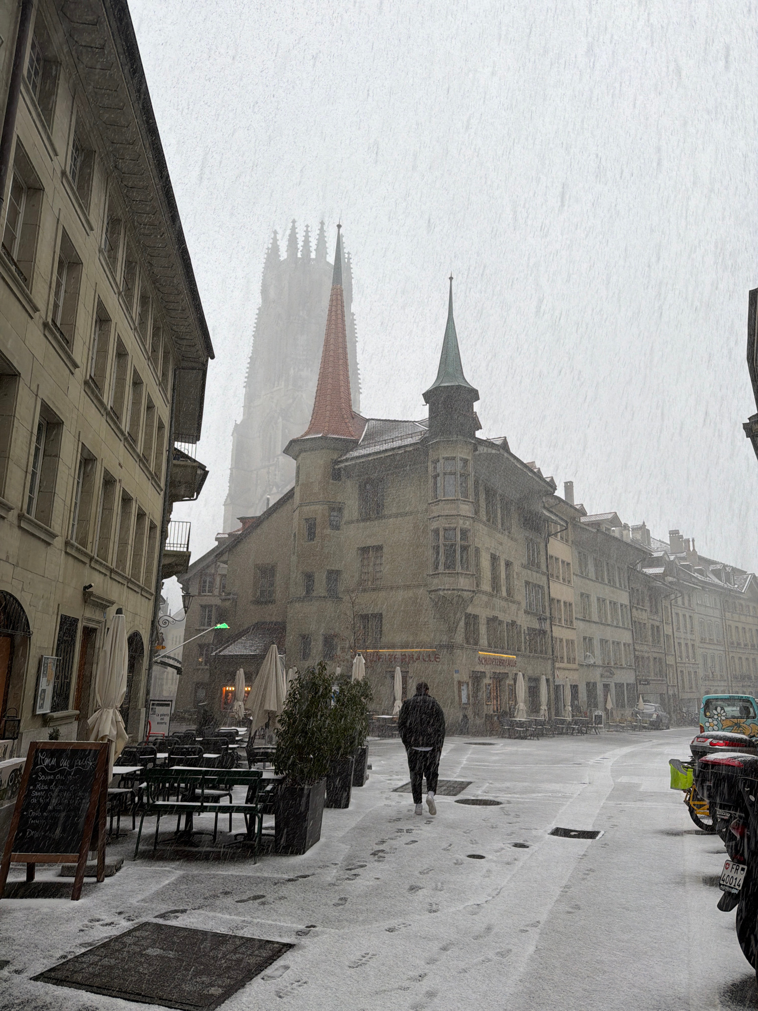 The scene depicts a snowy urban street in Fribourg - Freiburg, Switzerland, specifically the Rue de Lausanne facing towards the St. Nicholas Cathedral. Heavy snowfall is visible, accumulating on all s…read more
