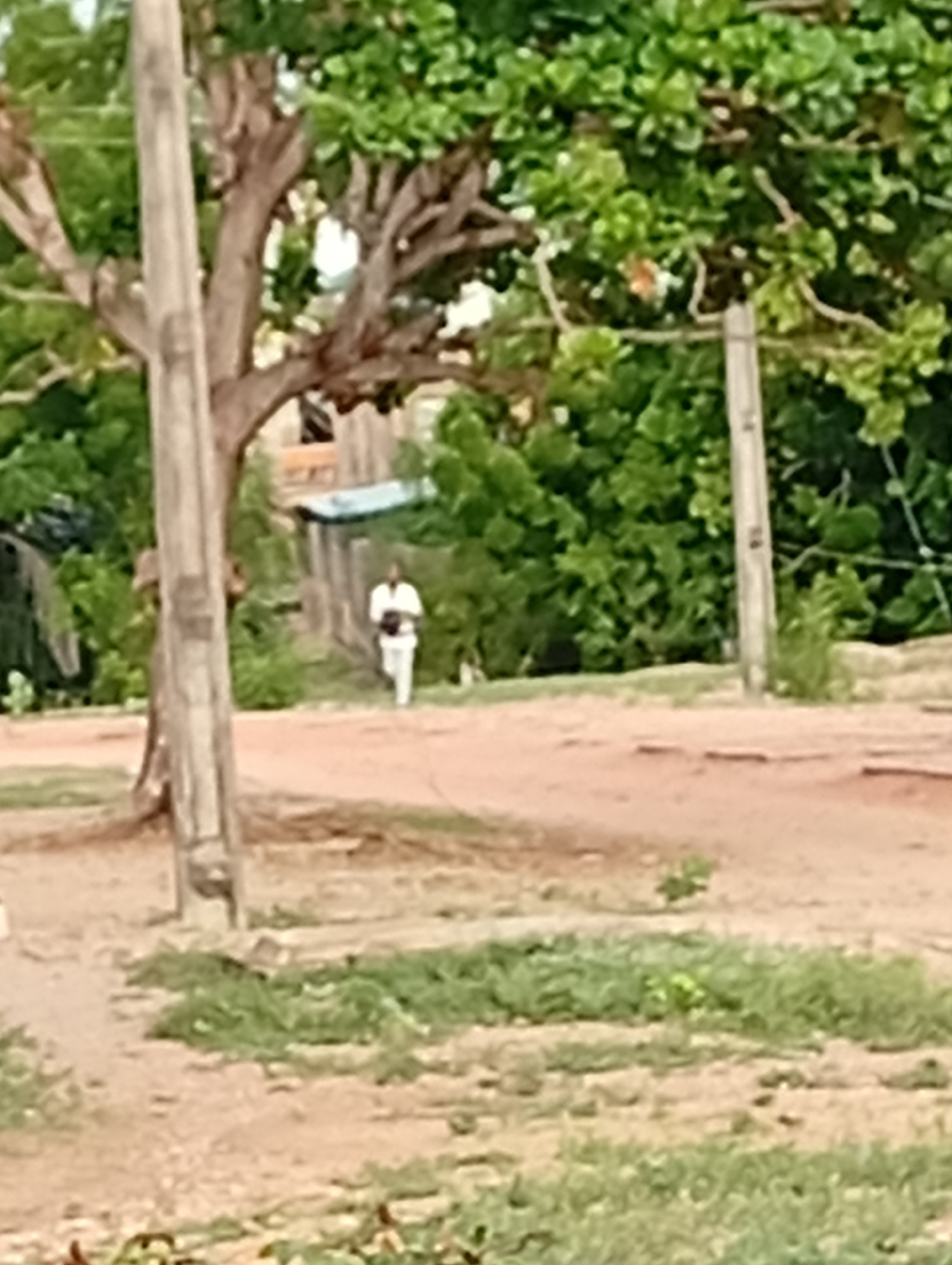 The image shows a dirt road in Adankolo, Nigeria, with sparse grass growing on the verges. Two wooden utility poles flank the road. A person wearing light-colored clothing is walking away from the cam…read more