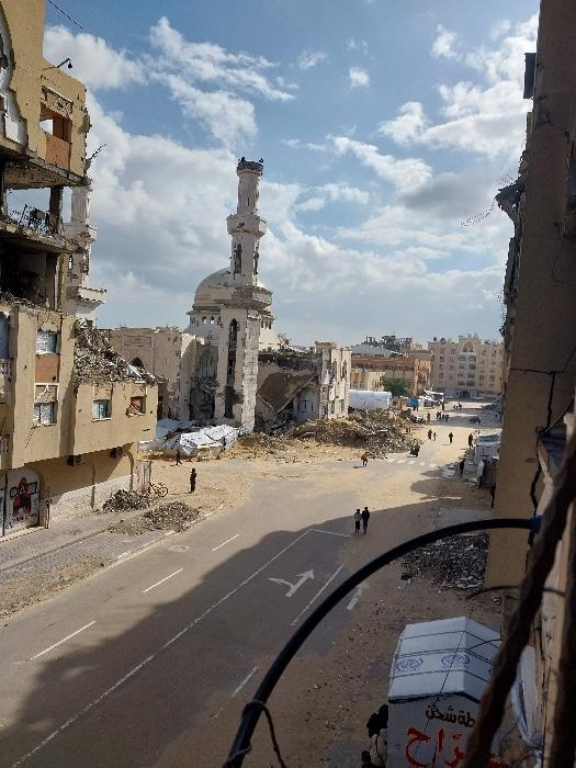 This image depicts a street scene in Khan Yunis, Palestinian Territory, under a partly cloudy sky with strong sunlight casting shadows. The perspective is from an elevated position, looking down a mai…read more