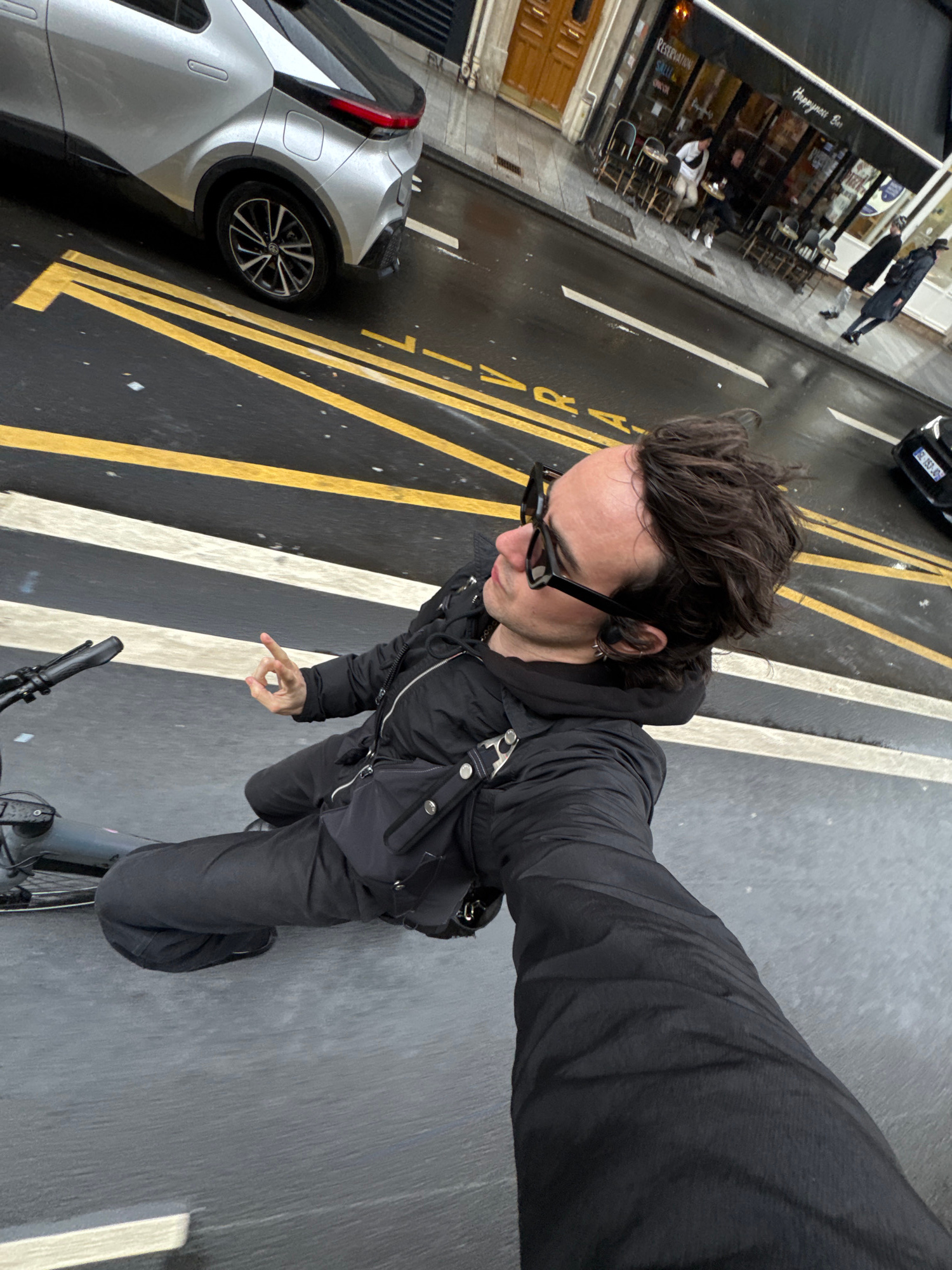 A man is riding a bicycle on a street in Paris, France. The street has yellow and white lines painted on it, indicating it is a designated lane. He is wearing a black jacket, black pants, and black su…read more