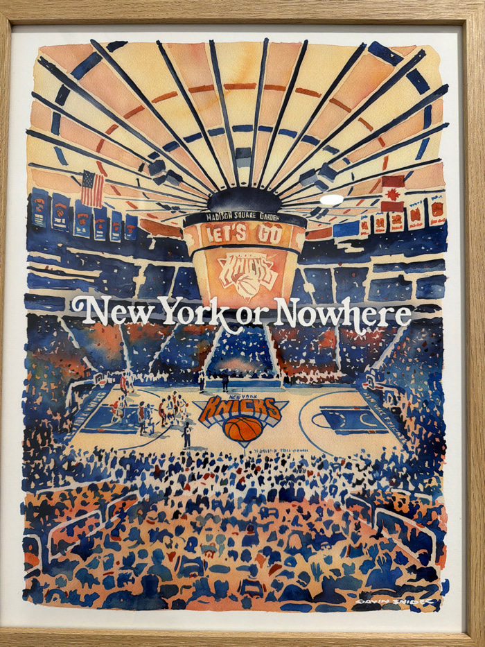 An artistic rendering, specifically a watercolor illustration, depicts the interior of Madison Square Garden, located in New York City, United States of America, during a basketball game. The artwork,…read more