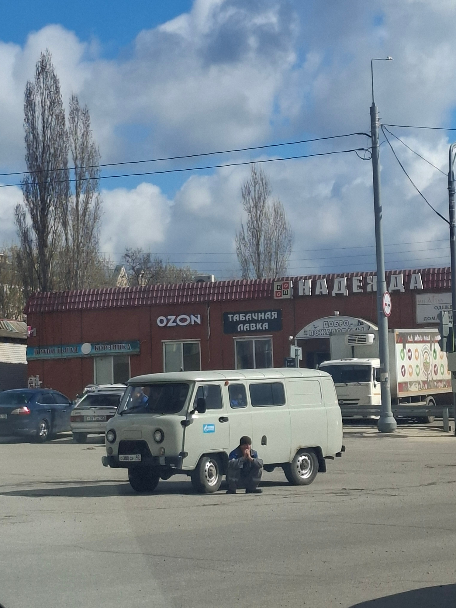 The image captures a street scene in what appears to be a town or city, featuring a multi-story building on the left, a street with several parked vehicles on the right, and a partly cloudy sky above.…read more