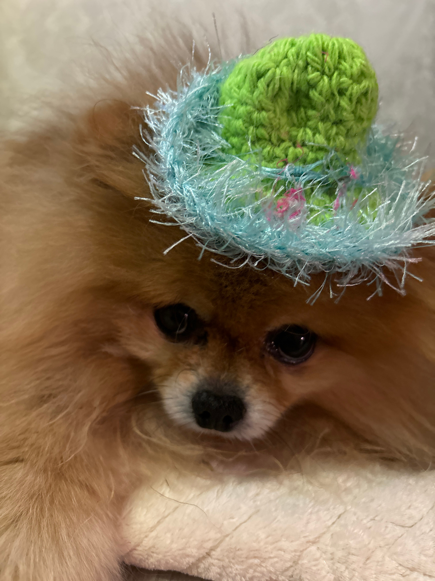 The image shows a close-up of a small, fluffy dog, likely a Pomeranian, with predominantly light brown and orange fur. The dog is lying down, looking directly towards the viewer with large, dark eyes.…read more
