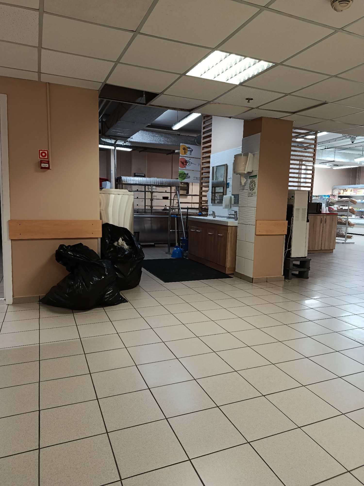 The image shows an interior view of a commercial space, likely a supermarket or food processing area. In the foreground, two large black garbage bags are positioned against a wall. The floor is covere…read more
