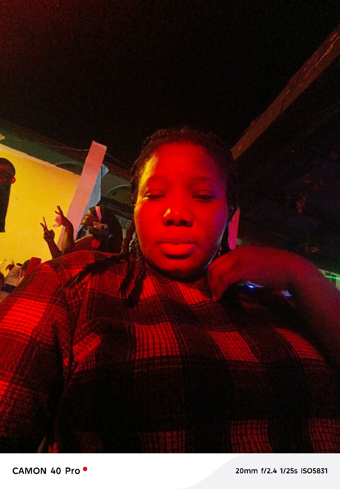Here is a detailed description of the image: The image is a close-up selfie taken indoors, likely at night given the heavy red lighting. The subject, a person with braided hair, is prominently featur…read more
