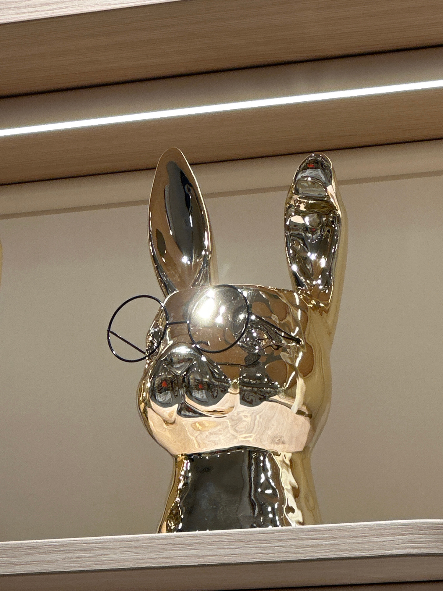 An abstract, highly reflective sculpture dominates the center of the image, appearing to be a stylized, elongated human arm or hand made of polished golden metal. The sculpture is oriented horizontall…read more