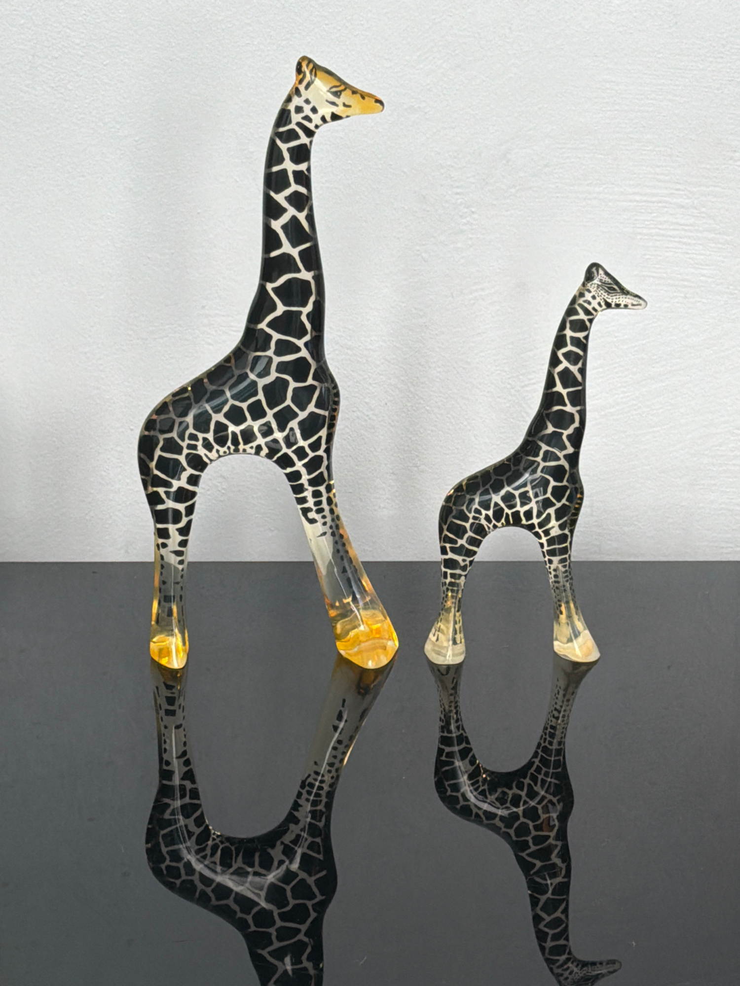 The image displays two abstract, stylized objects against a vertically divided background. The objects exhibit a distinctive giraffe-like pattern of irregular dark shapes on a lighter, glossy surface,…read more