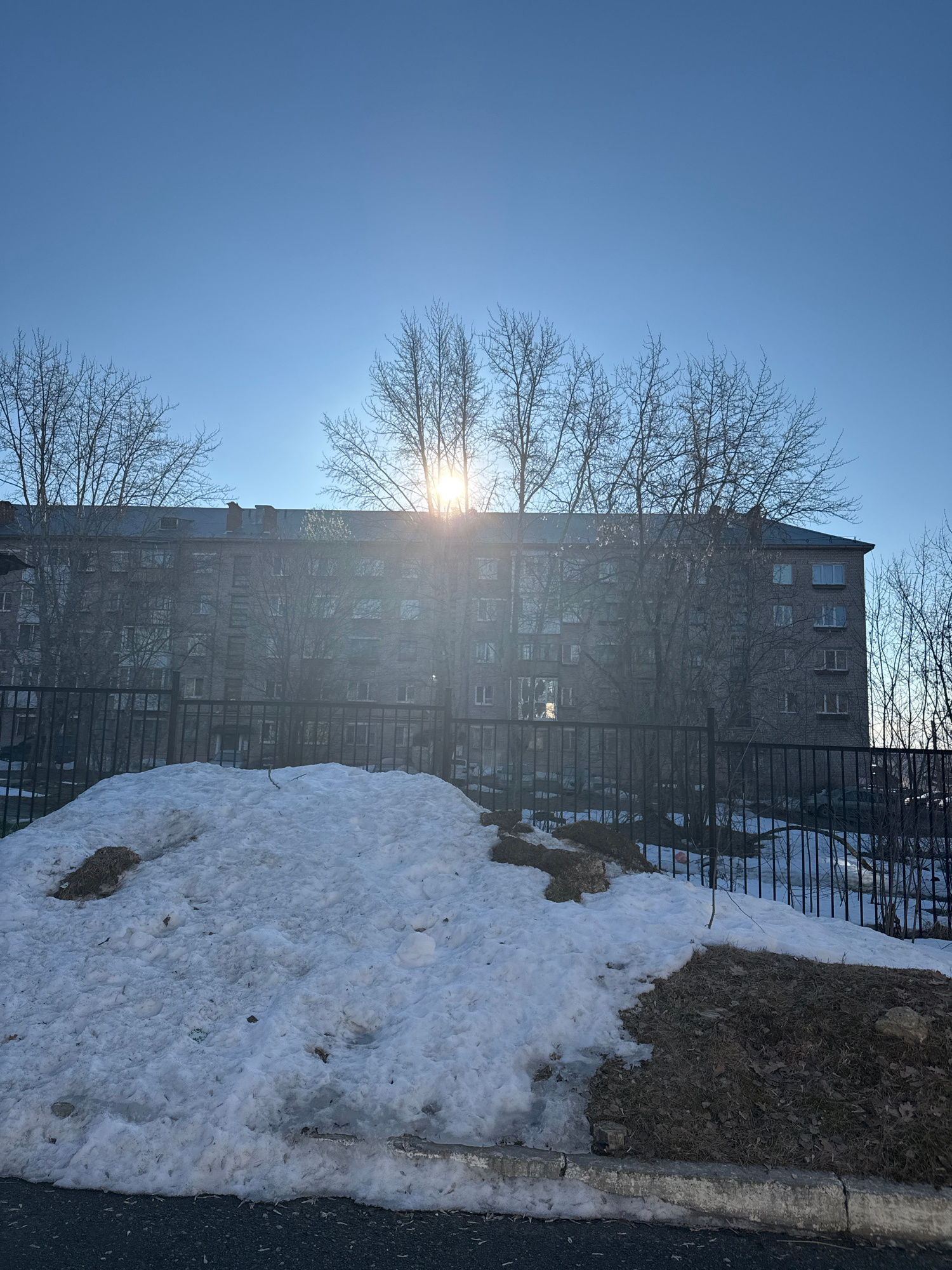 The image presents a scene in Berezniki, Russia, likely taken during late winter or early spring. A multi-story brick building dominates the central background, partially obscured by bare trees. The s…read more