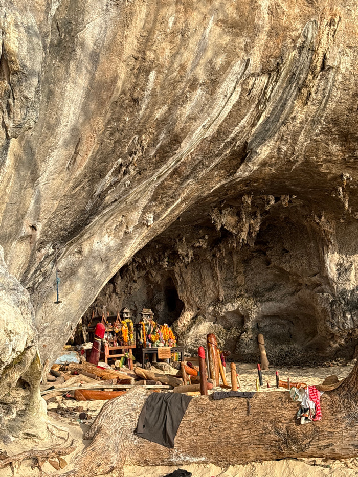 The image displays Phra Nang Cave, located on Phra Nang Beach in Ban Ao Nang, Krabi province, Thailand. The scene focuses on the interior of a natural limestone cave characterized by a high, textured…read more