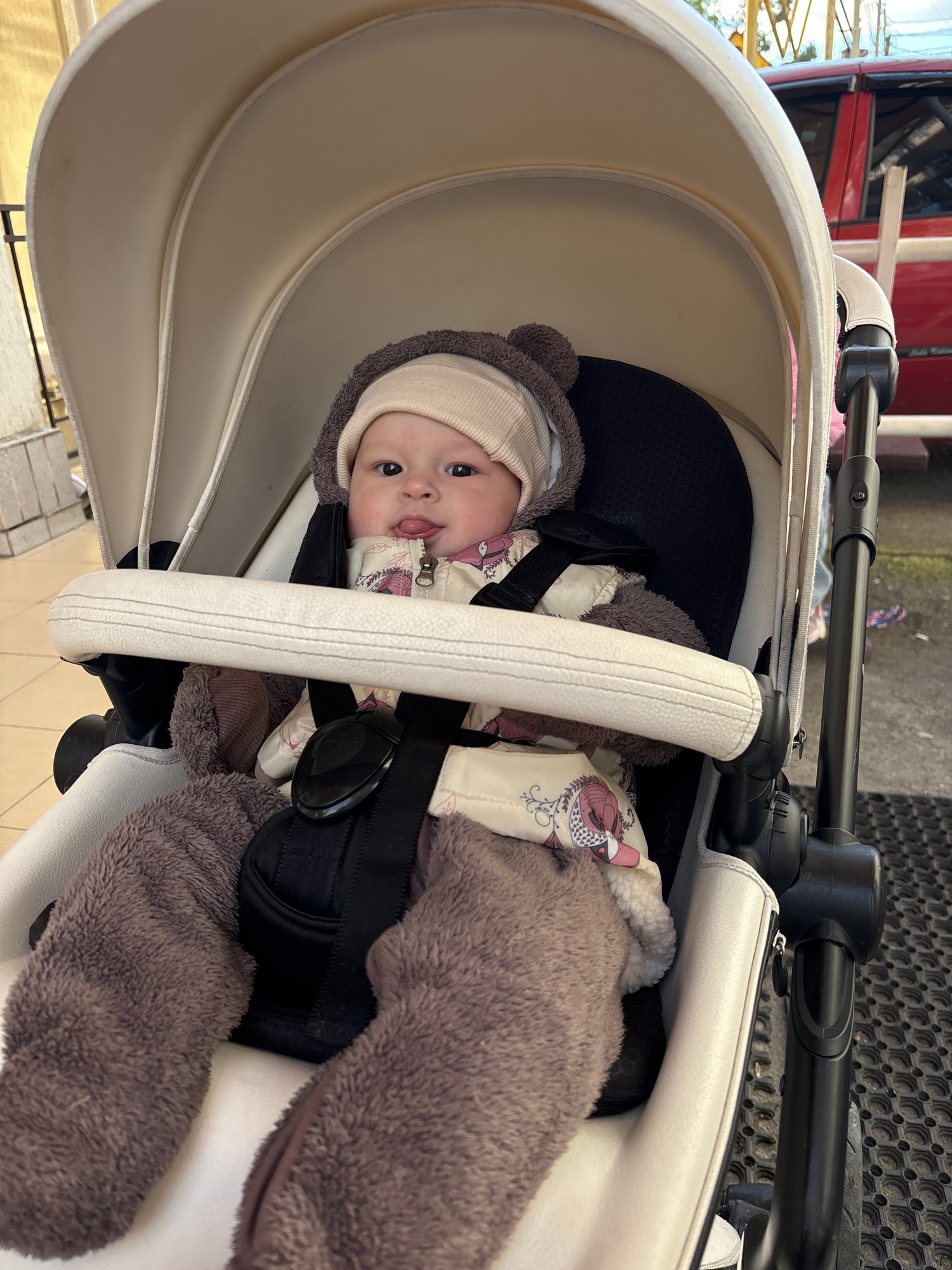 A baby wearing a light-colored hat and a brown furry jacket with a floral pattern is buckled into a stroller. The stroller has a light-colored hood and a black handlebar. A red vehicle is partially vi…read more