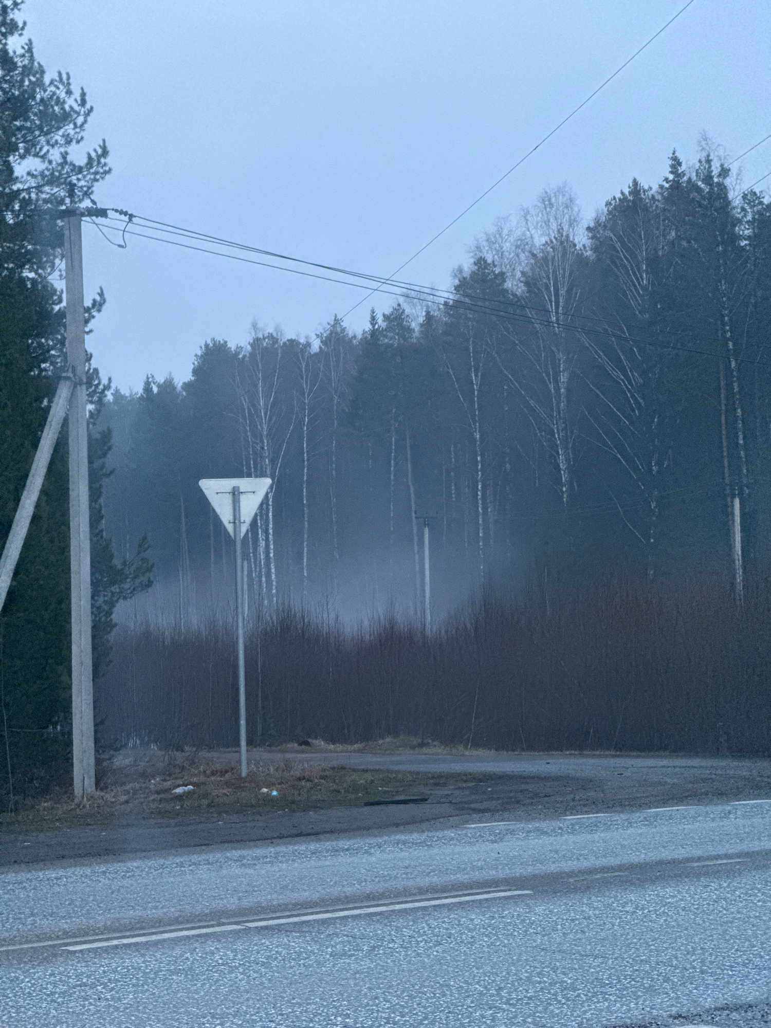The image depicts a view on a gray, overcast day along a road in Chaikovsky, Russia. The roadside is to the right, featuring an asphalt road with a white line marking the edge. To the left of the road…read more
