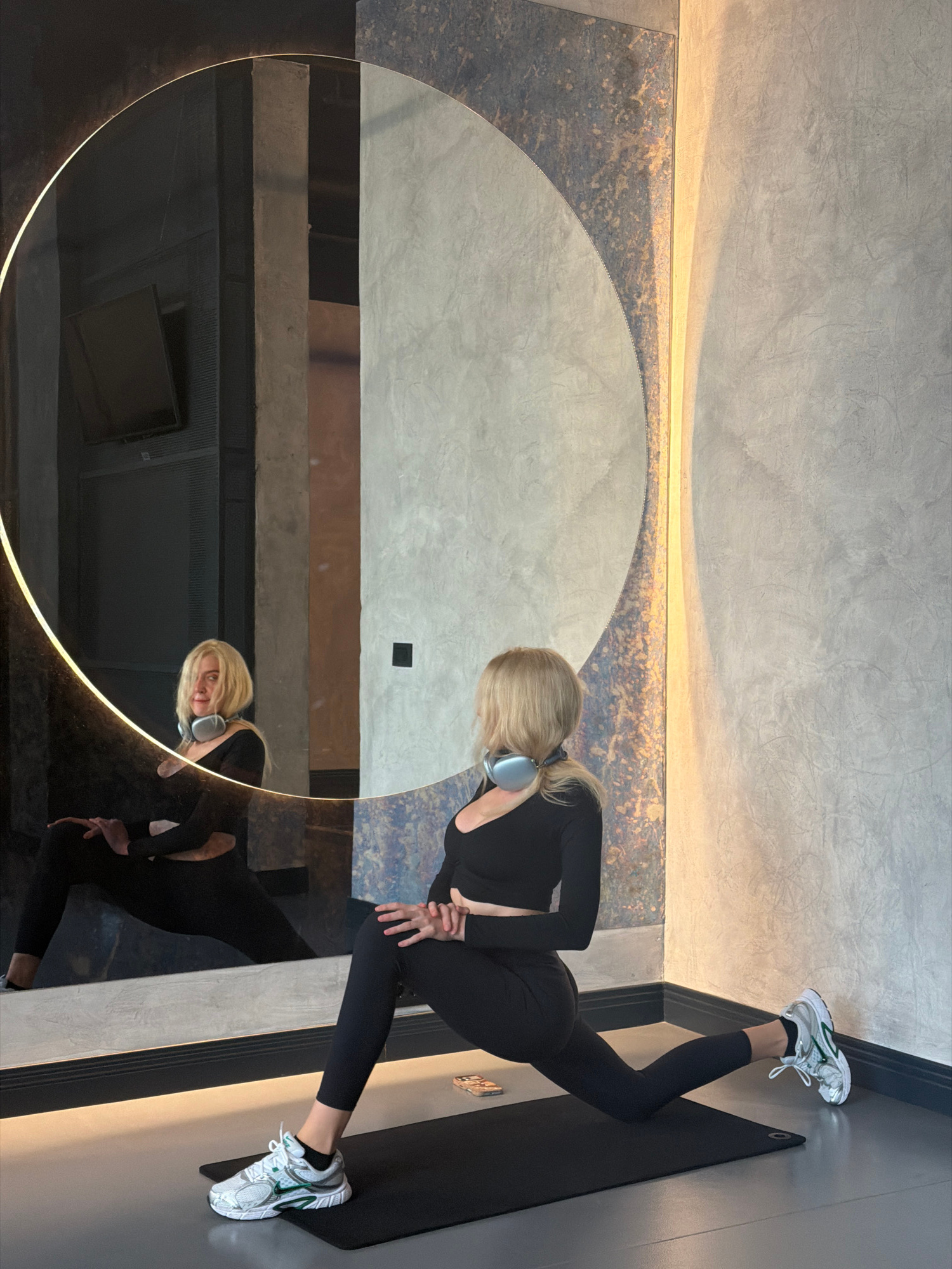 The scene depicts a modern fitness or studio interior in Belgrade, Serbia. A blonde woman, wearing a black long-sleeved crop top, black leggings, and white and green athletic shoes, is performing a lo…read more