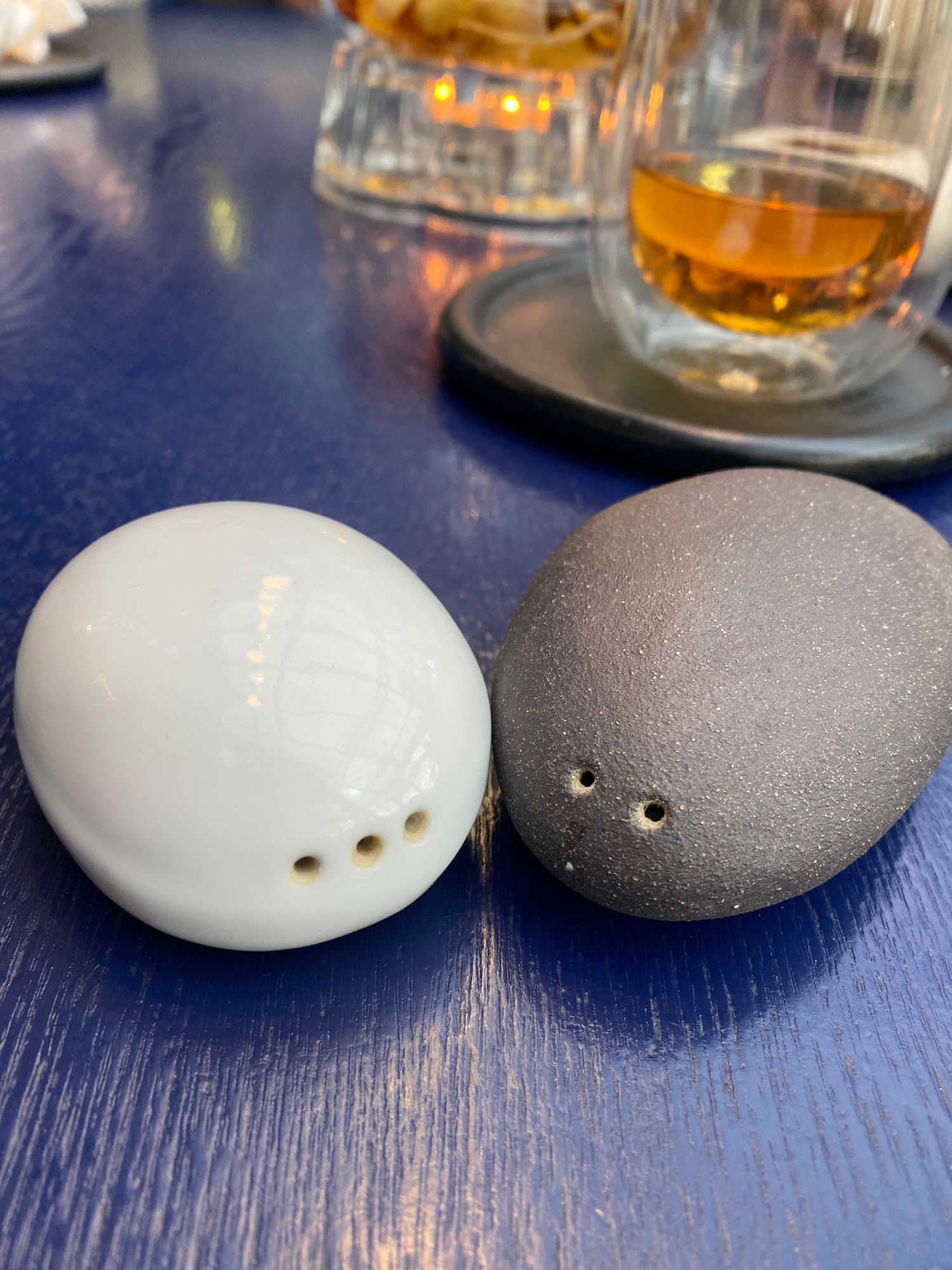 The image shows a close-up of a dining table setting, likely indoors. A pair of salt and pepper shakers is prominently featured, one gray with two holes and the other white with three holes. To the le…read more