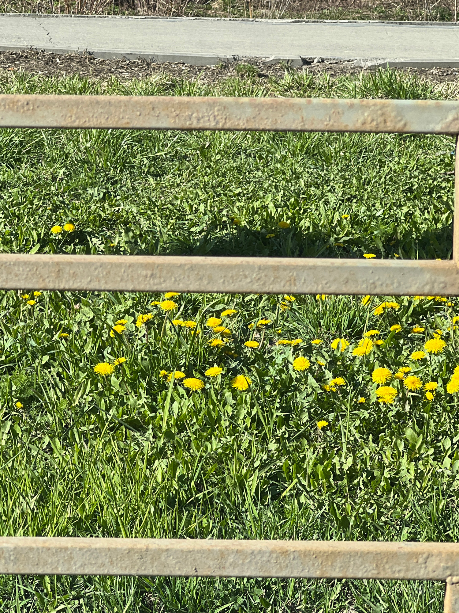The image captures an outdoor scene in Izhevsk, Russia, looking downwards through the vertical bars of a metal fence or railing. Five evenly spaced, light-brown metal bars, showing signs of weathering…read more
