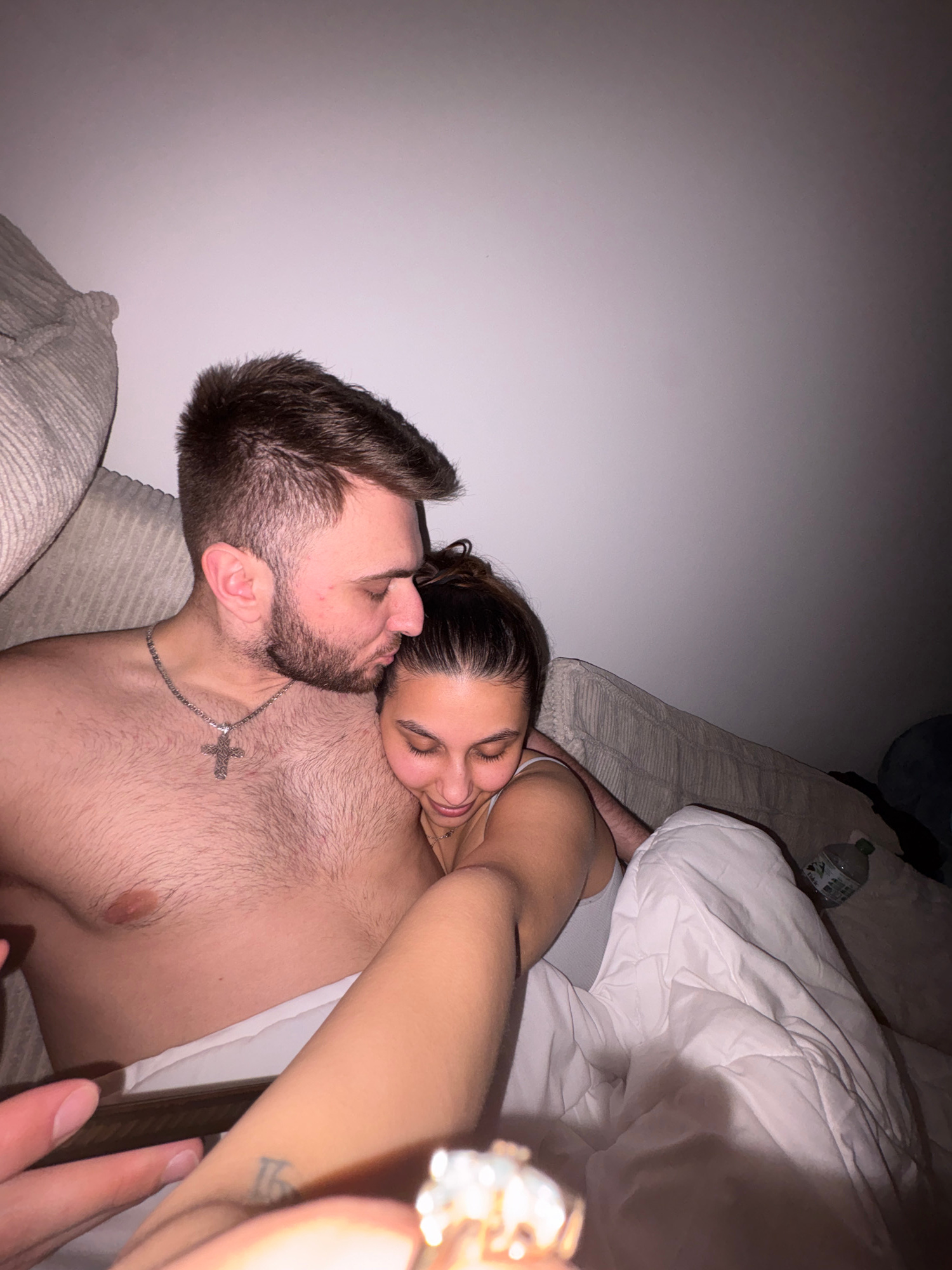 Two people are lying in bed together. The man is on his back, and the woman is lying on top of him, with her head resting on his chest. The man has a beard and is wearing a necklace with a cross penda…read more