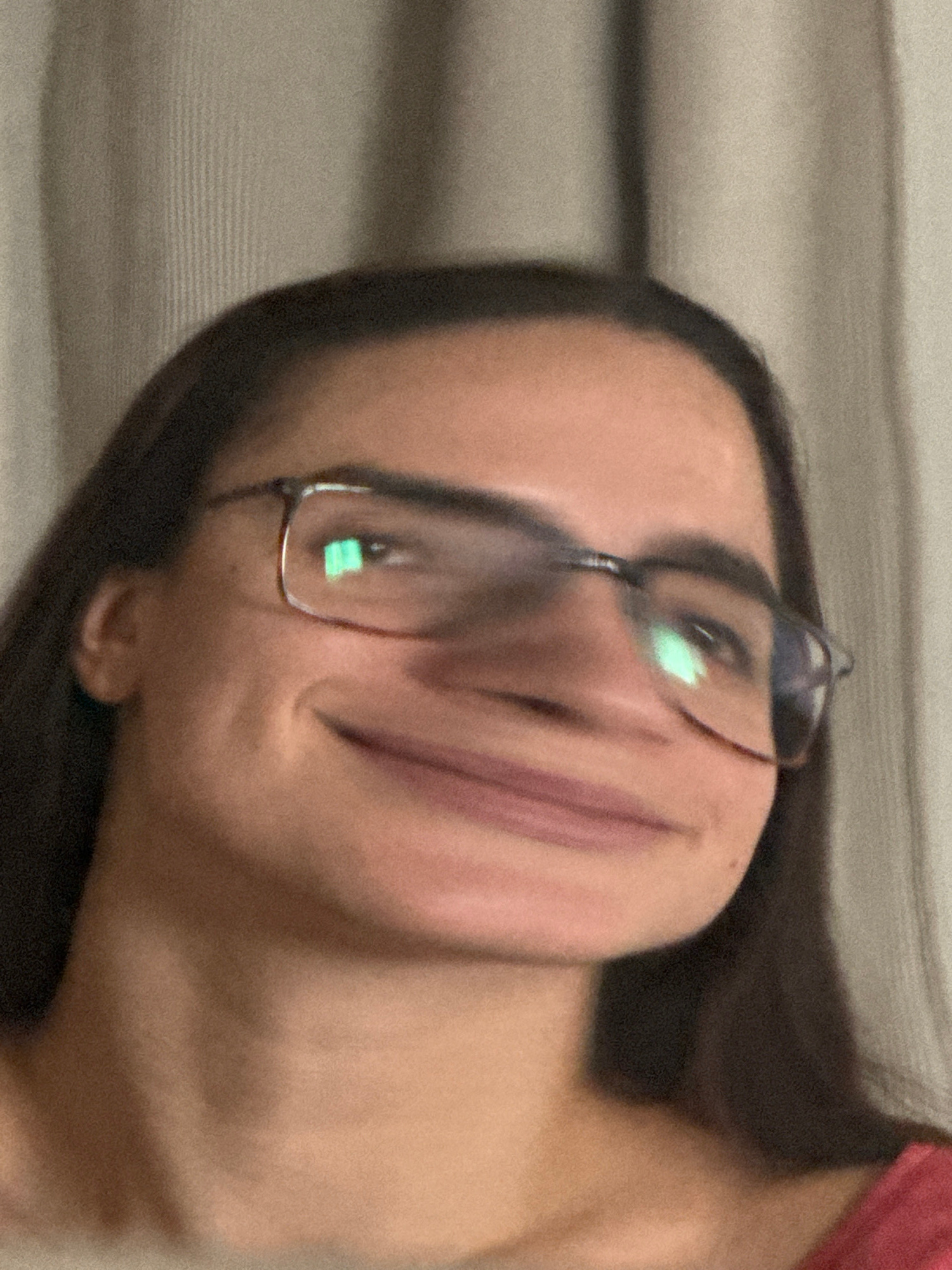 A close-up, slightly tilted image shows a woman with brown hair and glasses, smiling gently. She is positioned in front of what appears to be a textured, light-colored background. The scene doesn't pr…read more
