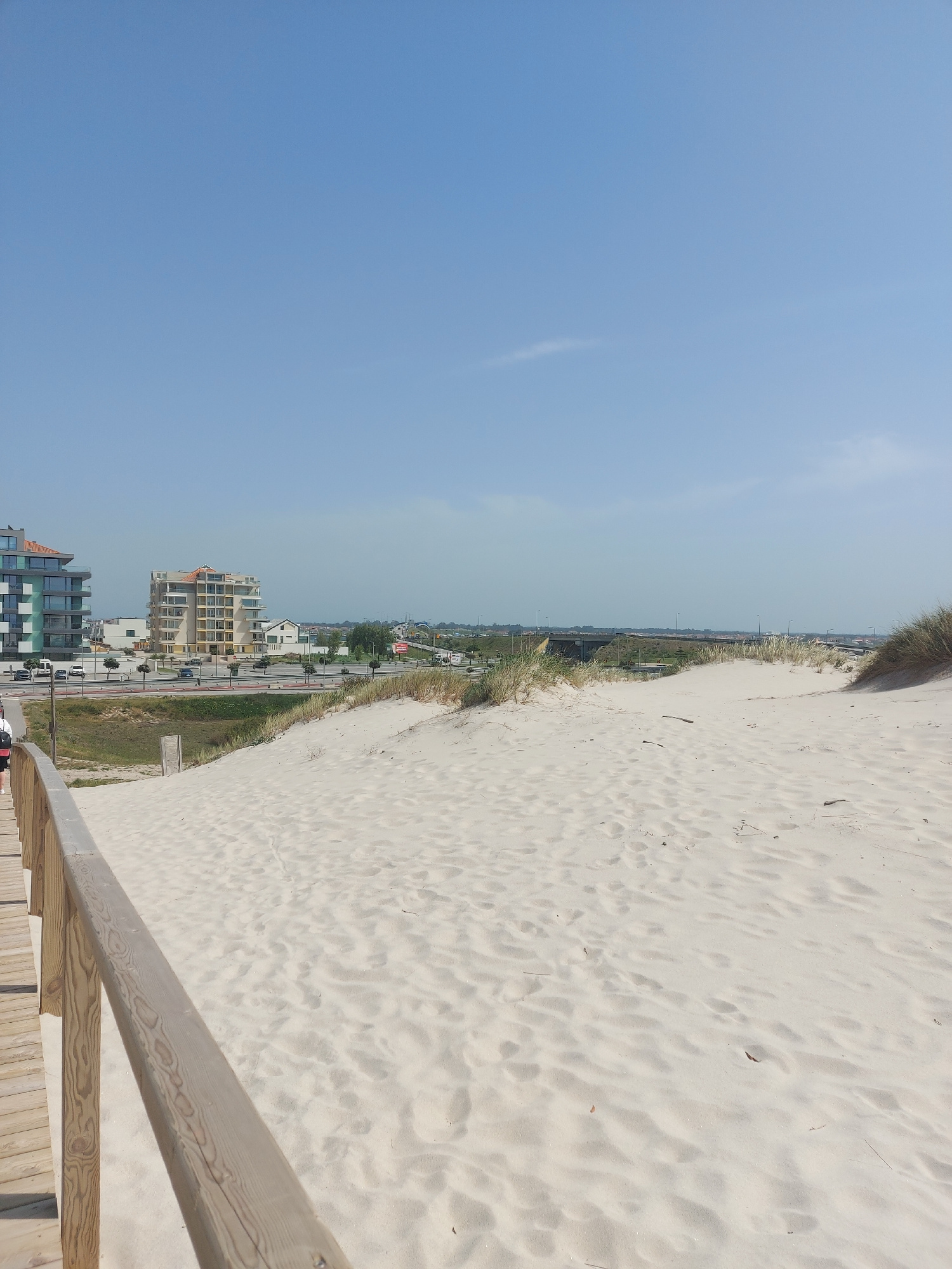 The image shows an elevated view of a beach scene in Gafanha da Nazaré, Portugal, looking toward the city. The foreground features light-colored sand dunes covered with sparse vegetation, and a wooden…read more