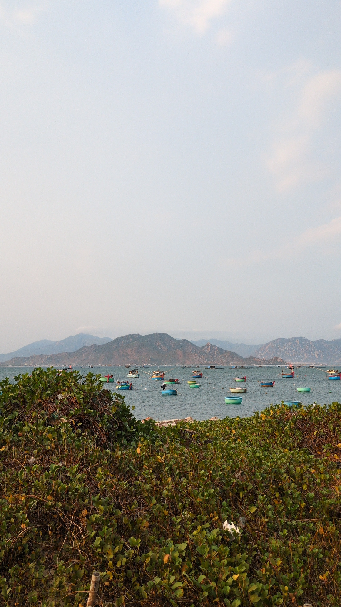 The image shows a coastal scene in Phan Rang – Tháp Chàm, Vietnam. On the right side of the frame, dense green foliage and vines are present. The sea occupies the central portion of the image, where n…read more