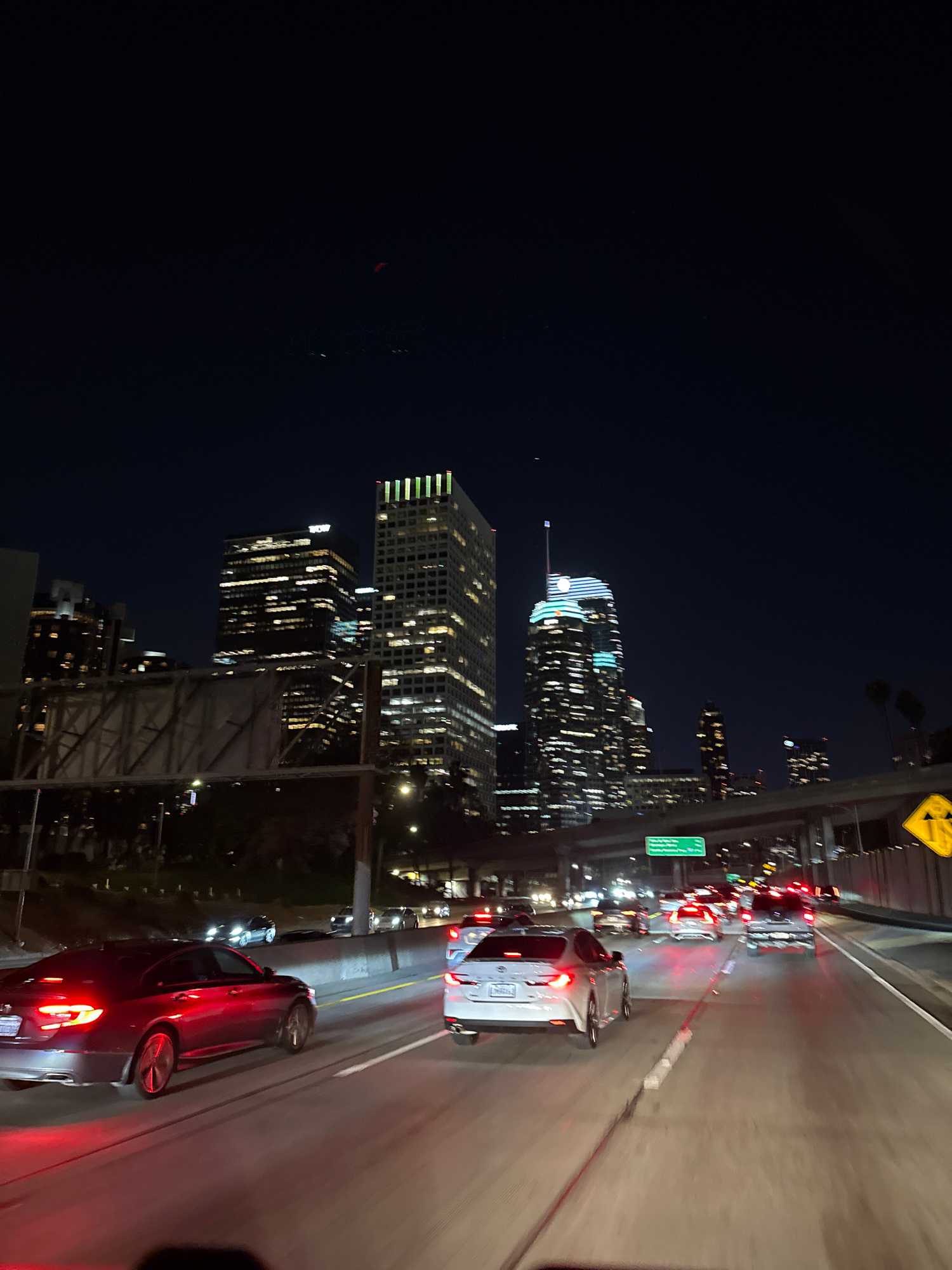 The image depicts a nighttime scene in Los Angeles, California. The view is likely from a vehicle on a highway or elevated roadway, with a line of cars ahead. To the left is the illuminated downtown L…read more