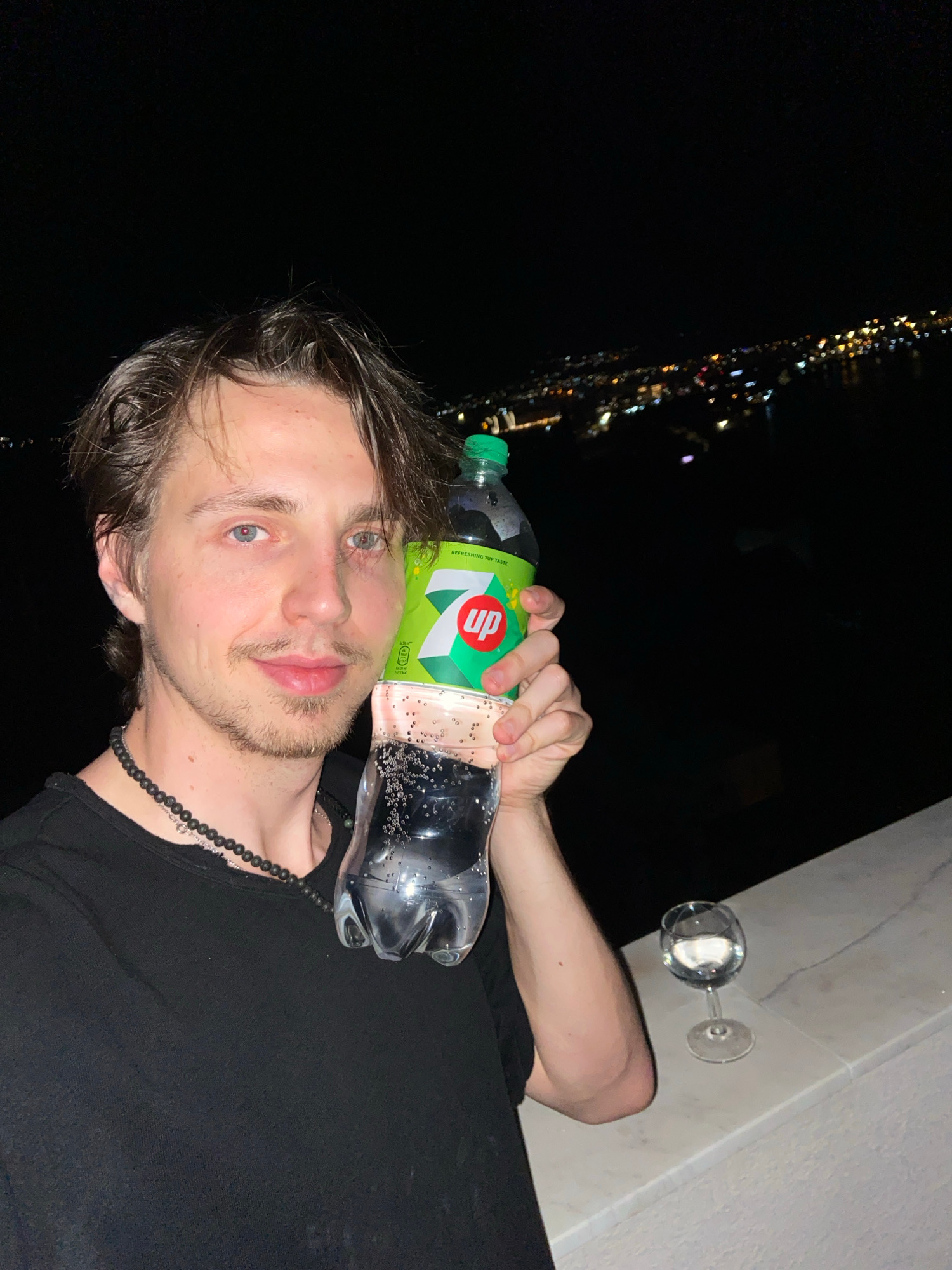 A man is holding a bottle of 7-Up in front of his face. He has light hair and blue eyes. He is wearing a black shirt and a beaded necklace. A wine glass is on a ledge. In the background, lights sugges…read more