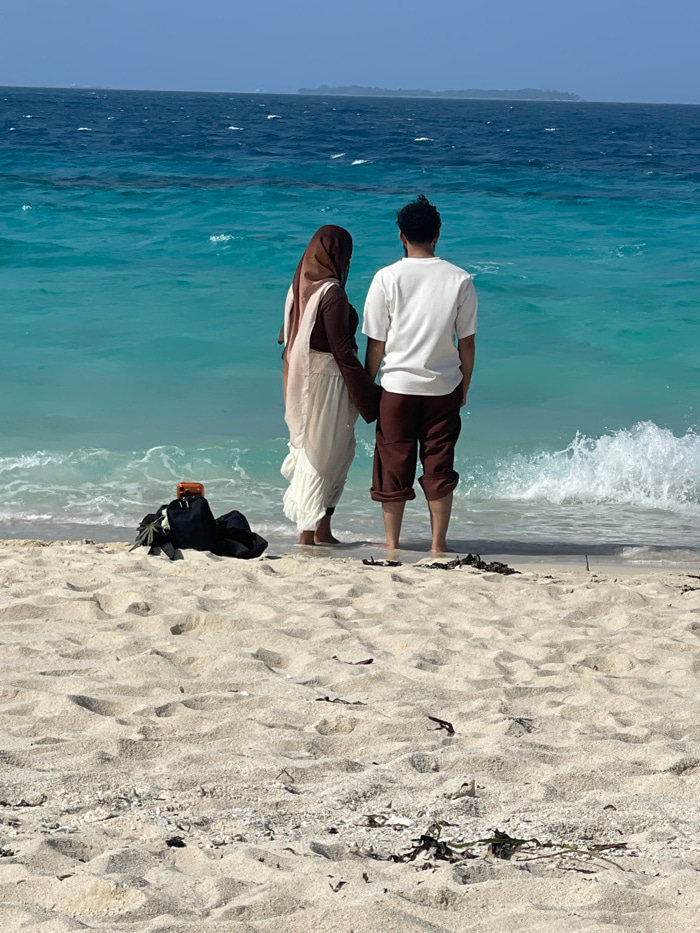 The image displays a beach scene in Zanzibar, Tanzania, under a clear sky. Two individuals stand with their backs to the viewer, facing a turquoise ocean, holding hands. The individual on the left wea…read more