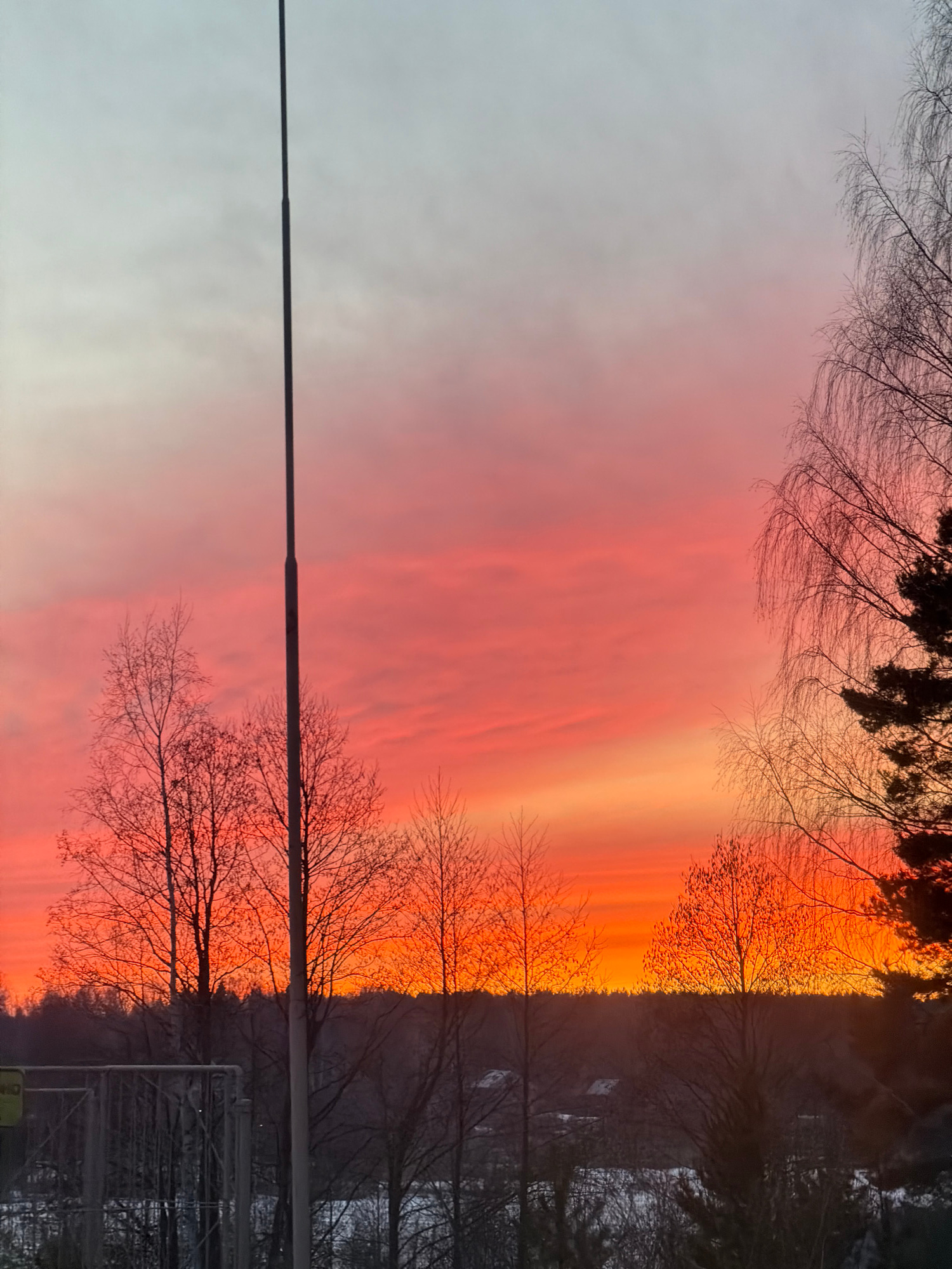 The image depicts a sunset in Izhevsk, Russia. The sky is filled with vibrant colors ranging from pink to orange, with bare tree branches silhouetted against the colorful backdrop. A utility pole exte…read more
