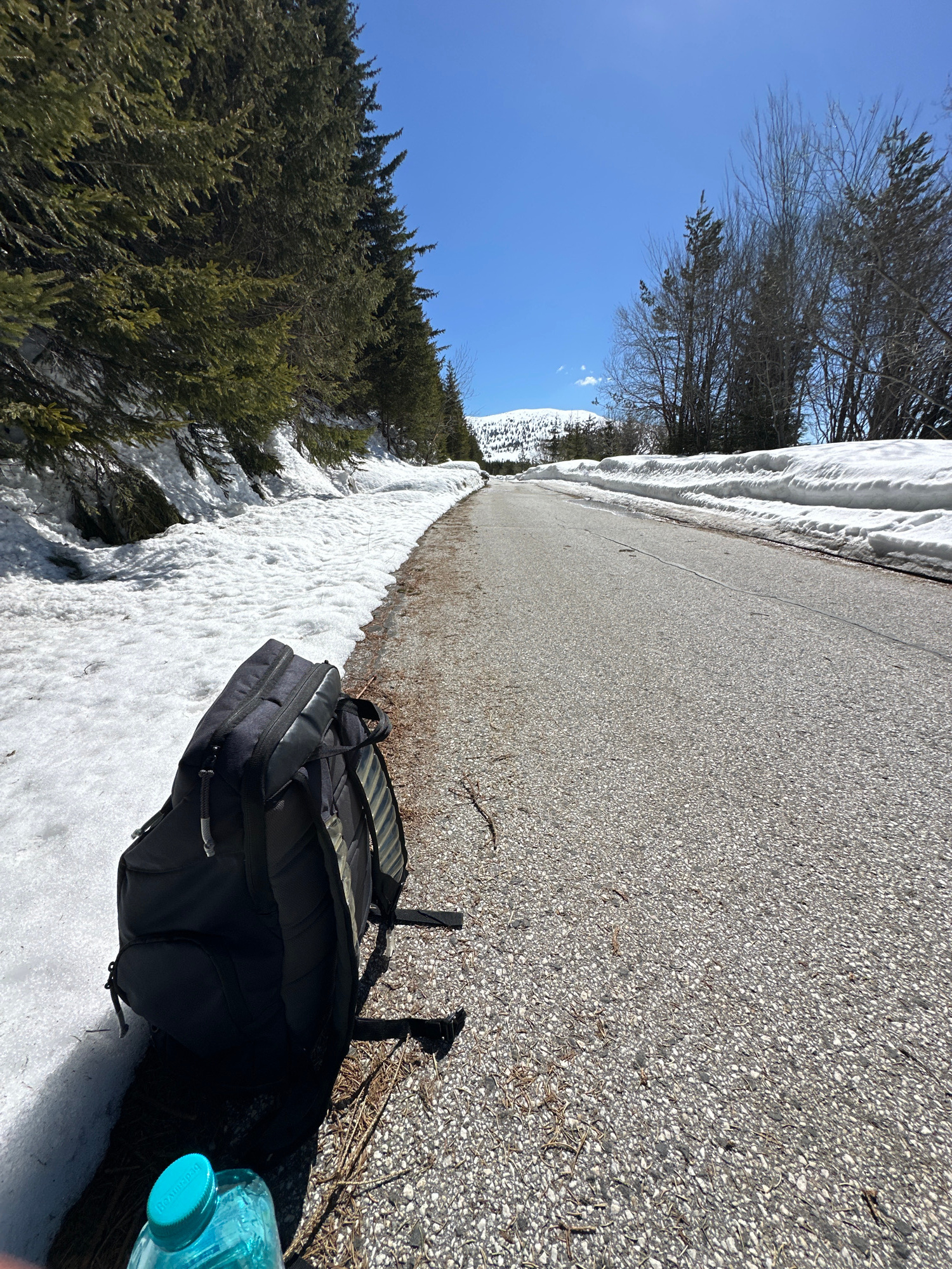 The image depicts a paved path with a snow-covered edge, likely located in a mountainous region, potentially near Yundola, Bulgaria. A black backpack and a blue water bottle are positioned on the snow…read more