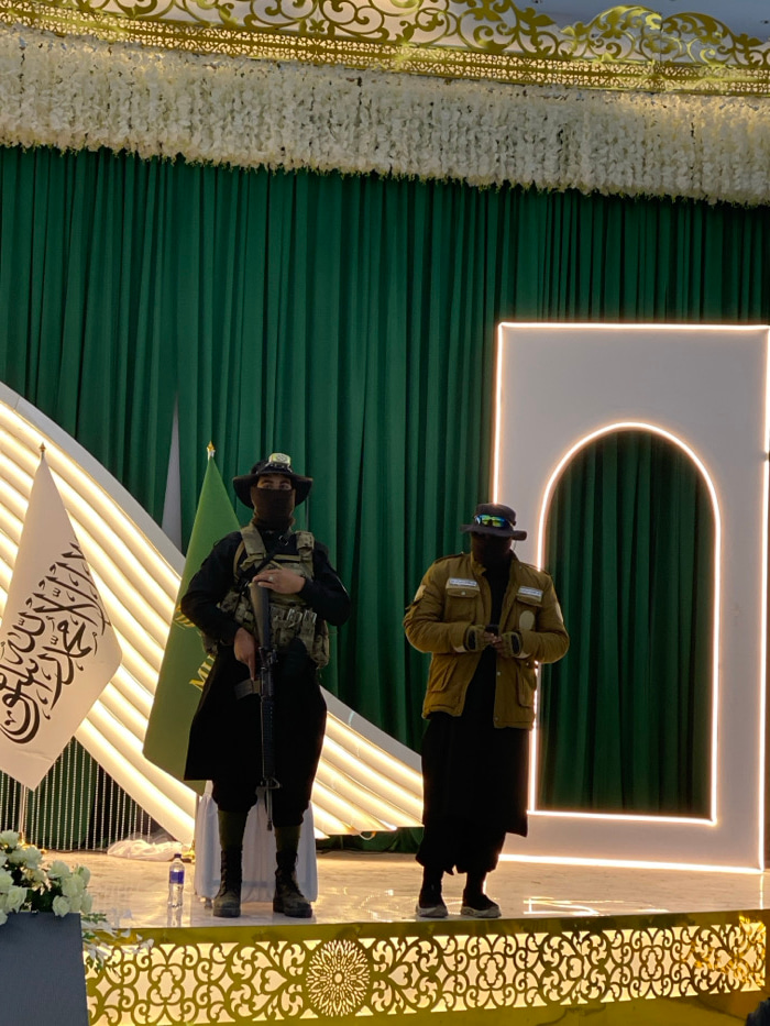 An indoor scene in Kandahar, Afghanistan, depicts two individuals standing on a decorated stage, likely during a formal event or ceremony. Both individuals are dressed in a combination of traditional…read more