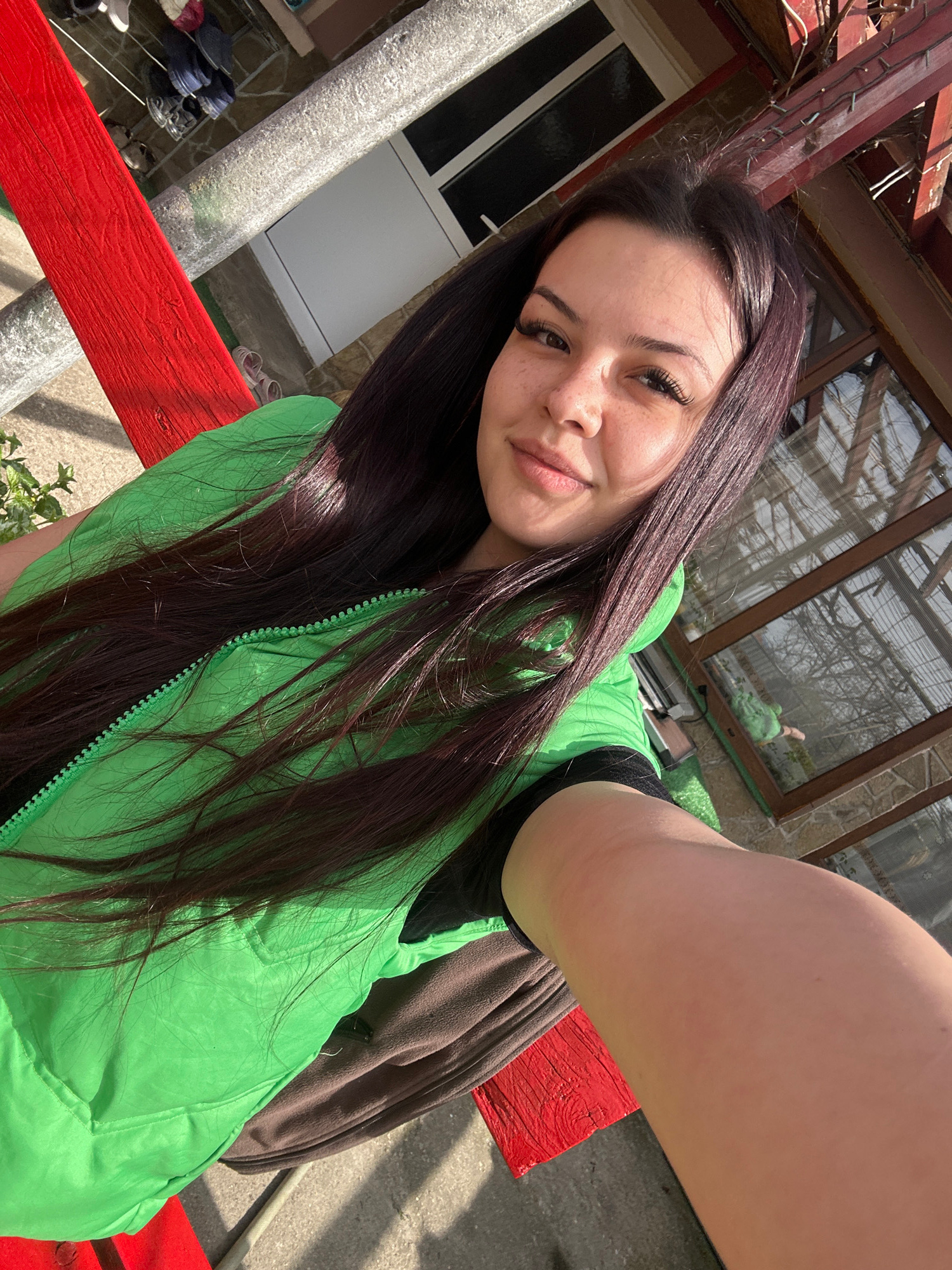 A young woman with long, dark hair poses for a selfie outdoors. She is wearing a bright green vest over a dark garment. The woman has fair skin and noticeable freckles. She is smiling gently at the ca…read more
