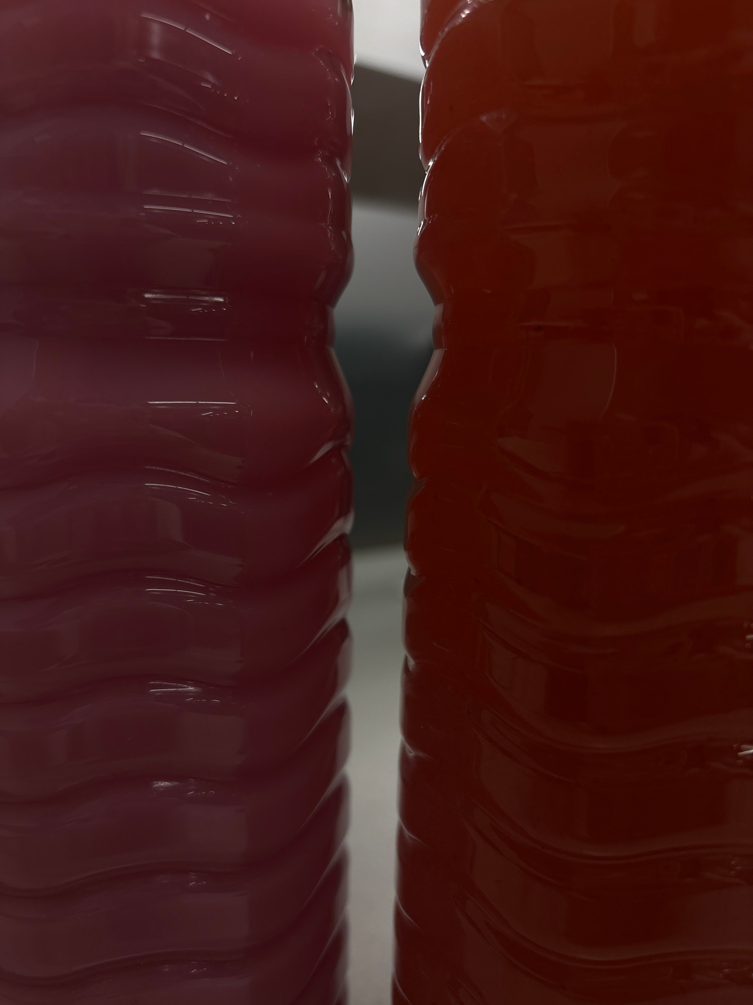 Two translucent, ribbed objects, appearing to be plastic bottles, are positioned closely together in the foreground. The top object is a deep reddish-brown, while the bottom is a lighter shade of redd…read more