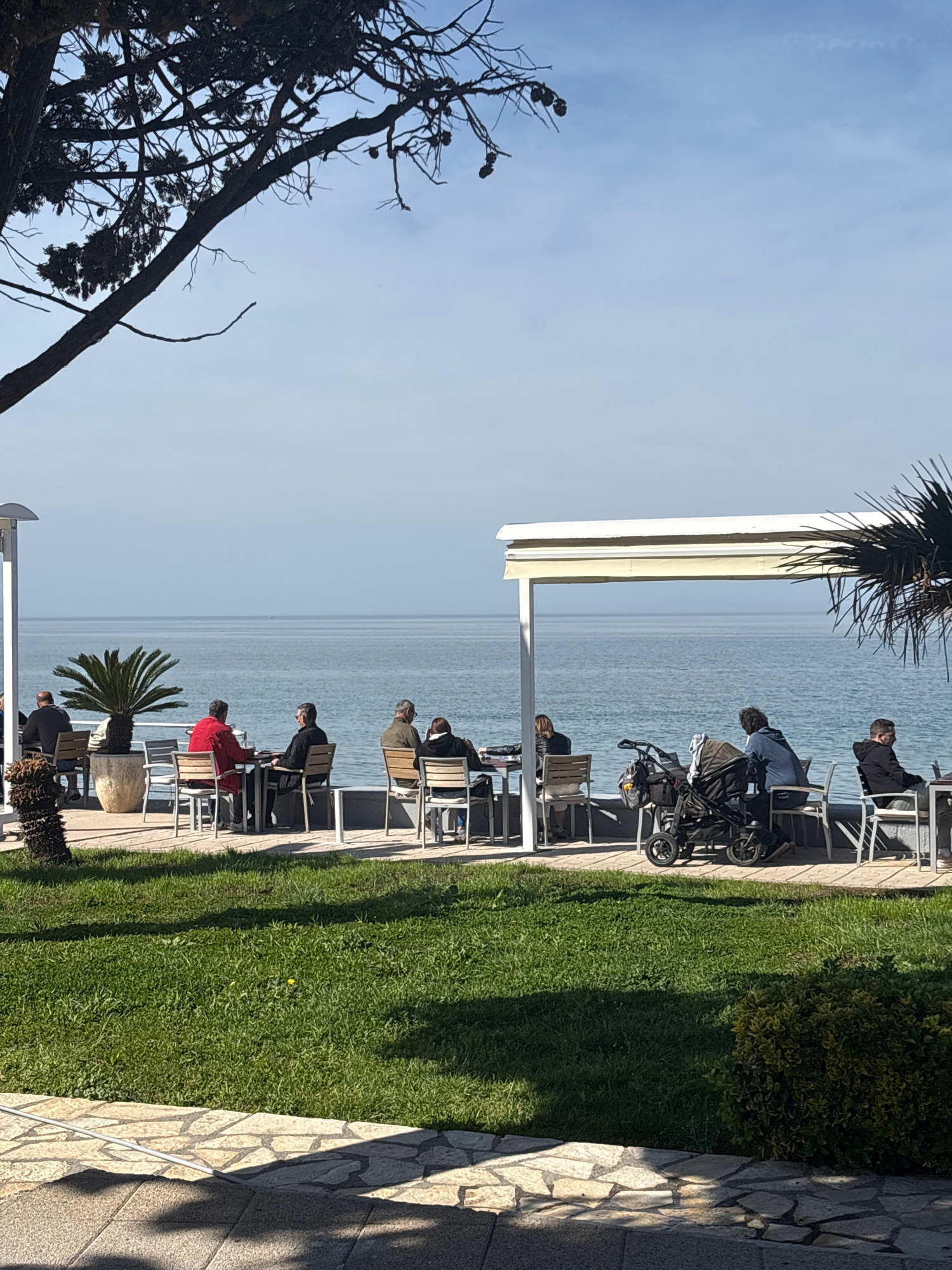 The image shows a row of seated individuals at an outdoor cafe in Bar, Montenegro, facing a body of water under a clear sky. The cafe's white chairs and tables are arranged along a strip of green gras…read more