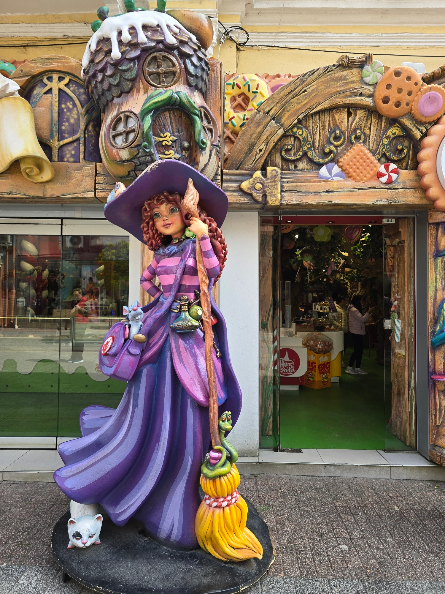 An eye-level, medium shot depicts a whimsical storefront featuring an elaborate candy-themed facade and a life-sized witch statue in Unknown, Unknown. The storefront's left side is adorned with oversi…read more