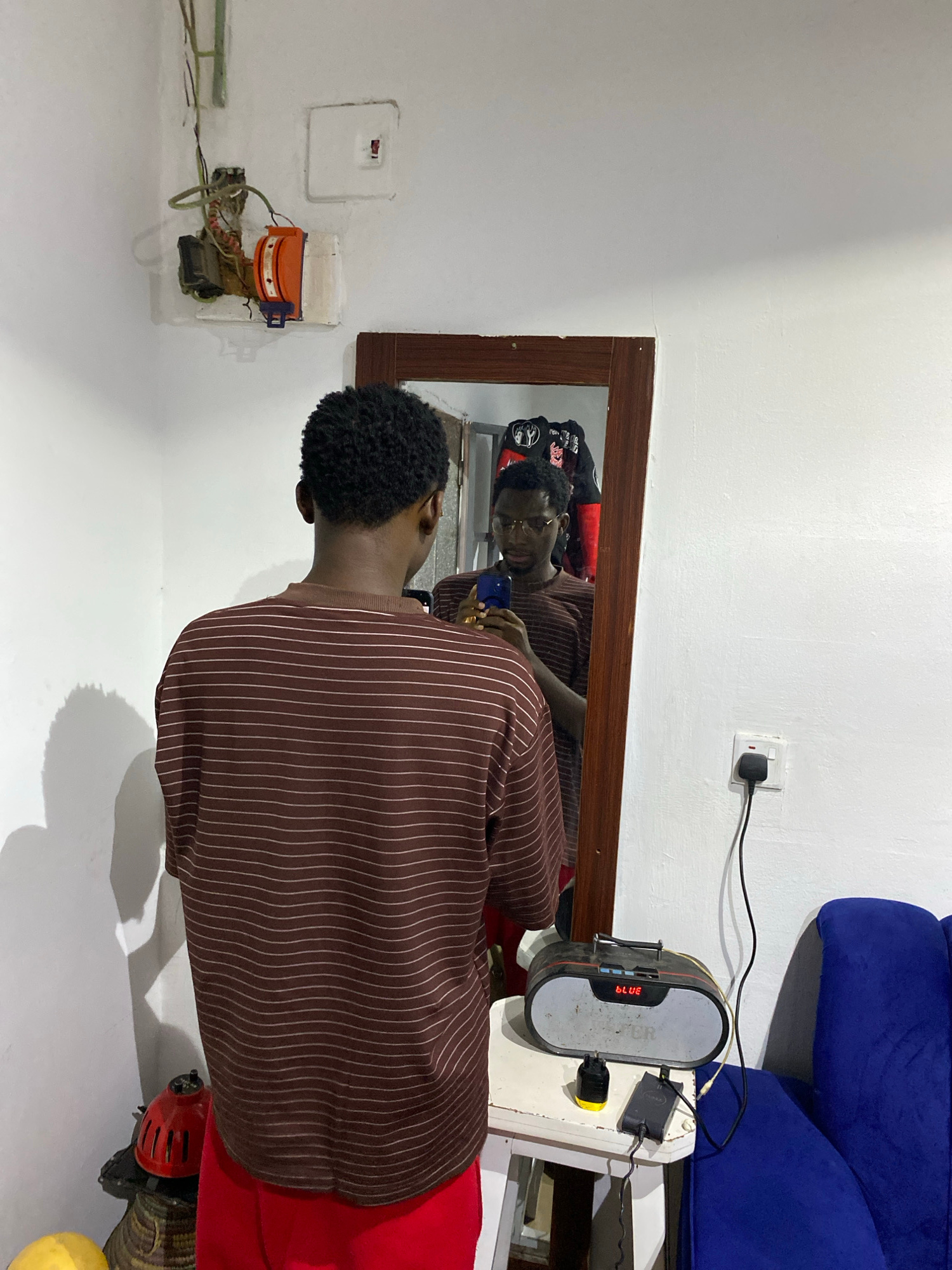 The image shows a young man inside a room, captured from a side profile view, facing a mirror. He has short, dark, curly hair and wears a brown long-sleeved shirt with thin white vertical stripes, and…read more