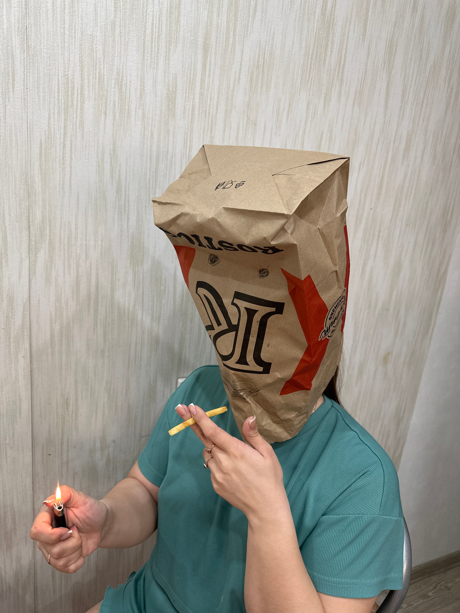 A person wearing a green t-shirt has a brown paper bag from a "Russian restaurant" over their head. They are holding a french fry in one hand and lighting a lighter with the other. The location is imp…read more