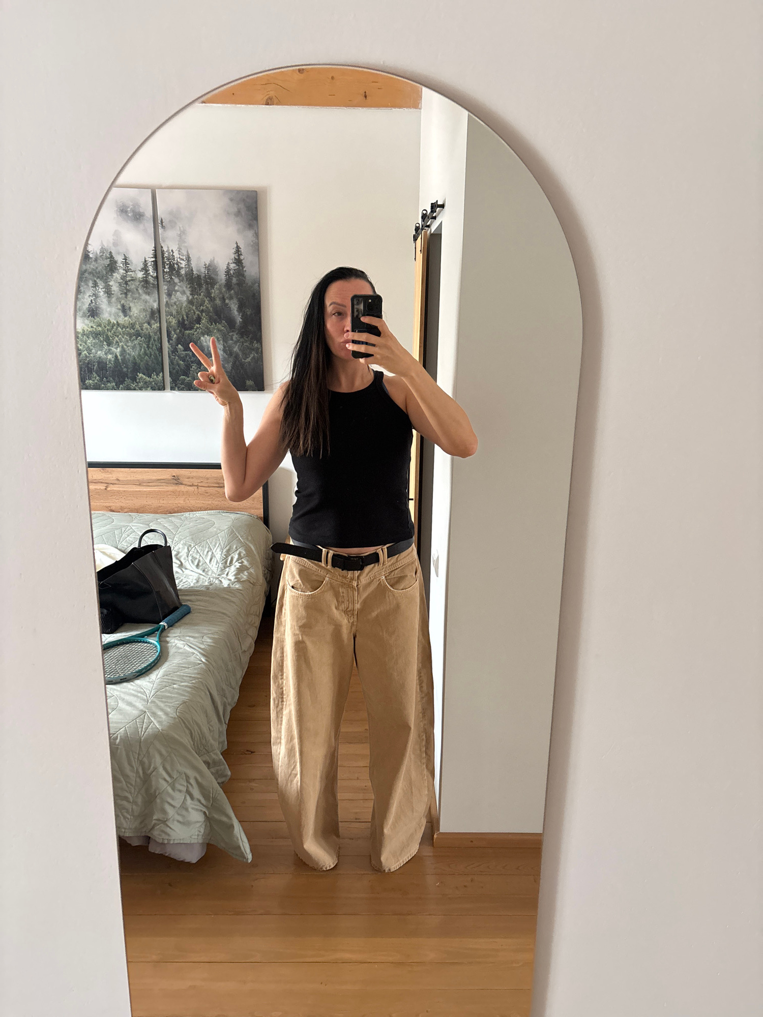 A woman is reflected in a mirror. She is wearing a black tank top and khaki pants, holding a smartphone to take a selfie. She makes a peace sign with her left hand. The mirror reflects a bedroom inter…read more