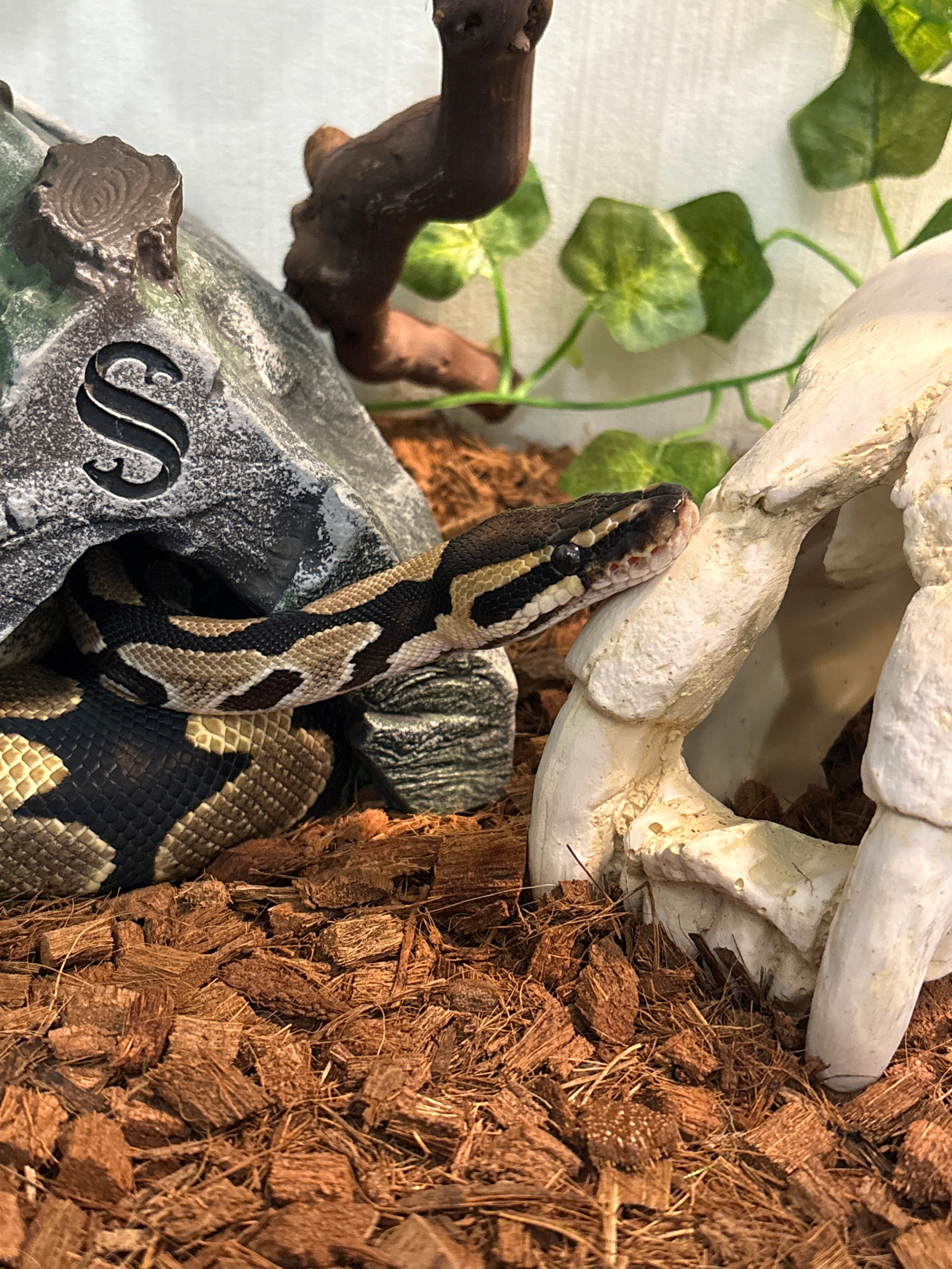 A ball python is resting inside a terrarium. The snake's head is near a white skull-shaped decoration. The snake's body is coiled around a grey stone decoration with a black flourish design. There is…read more