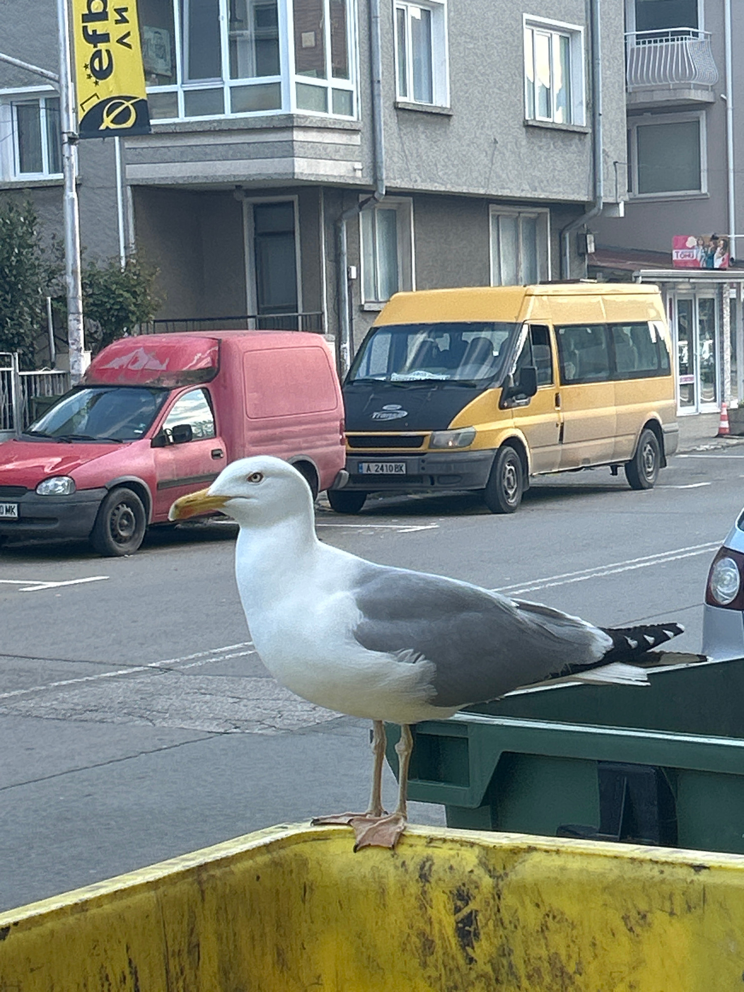 An urban street scene in Pomorie, Bulgaria, is captured in daylight. The photograph is oriented vertically, showing a dominant white and grey seagull perched on the edge of a large, weathered yellow r…read more