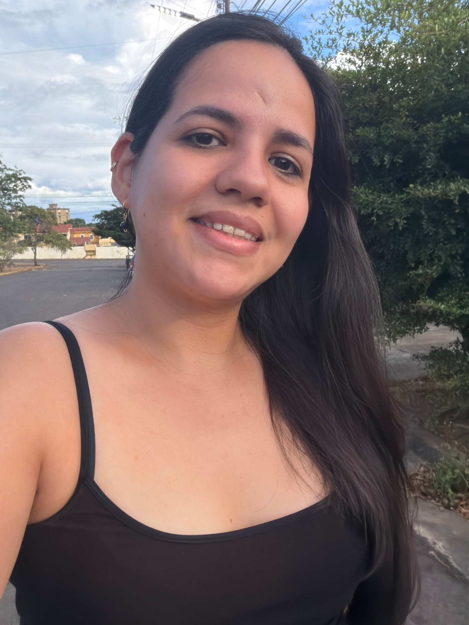 A young adult female is depicted in a close-up, outdoor portrait, likely a selfie, taken in Guayana City, Venezuela. She has long, dark, straight hair, dark eyes with visible eyeliner, and a slight sc…read more