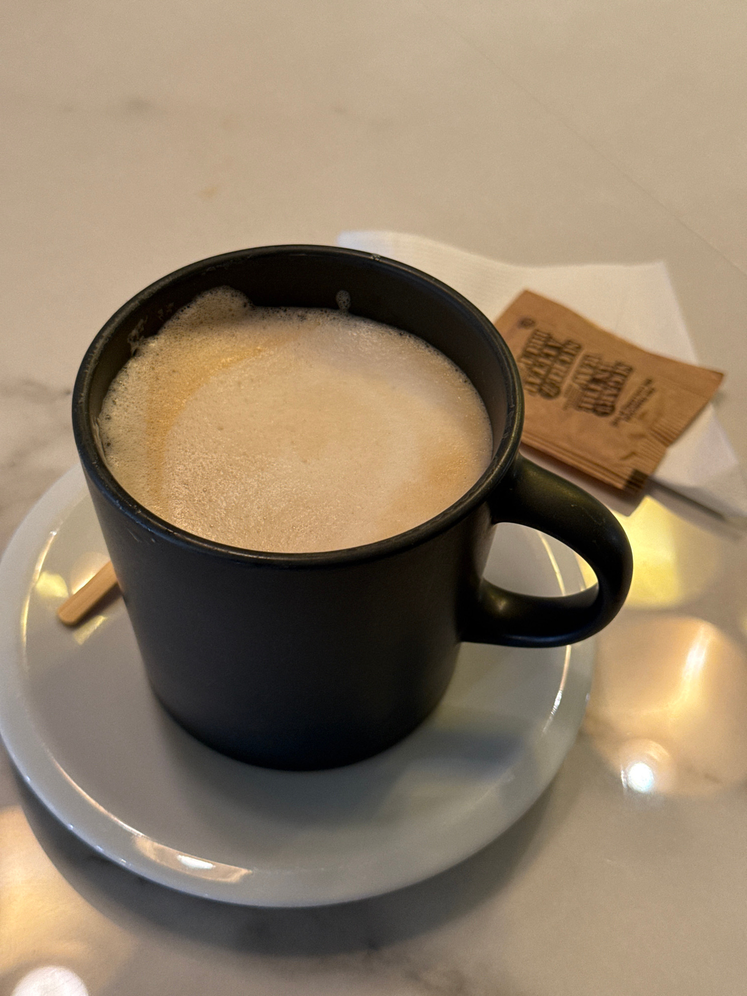 The image presents an overhead, slightly angled view of a black ceramic mug filled with a frothy, light-brown beverage, likely coffee or a latte. The mug rests on a simple white saucer, which in turn…read more